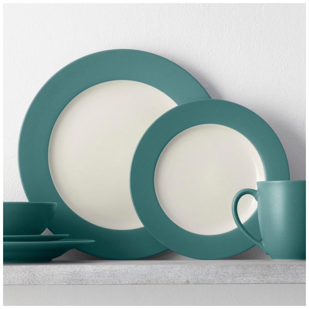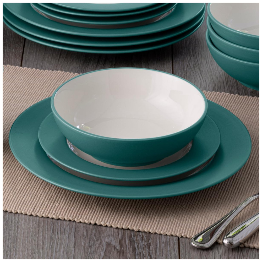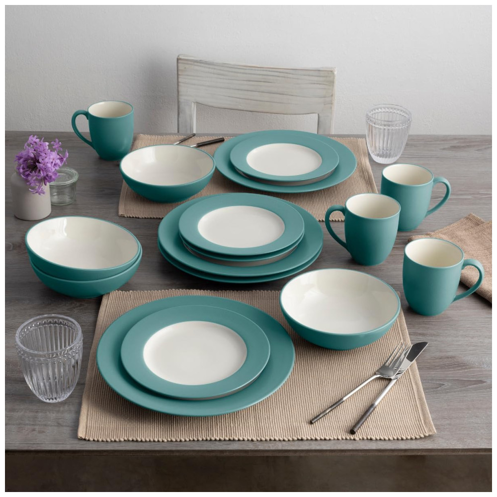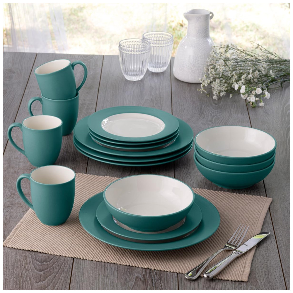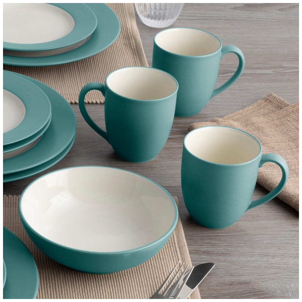 O conjunto Noritake Colorwave Turquoise de 16 peças serve 4 pessoas, com 4 pratos de jantar, 4 pratos de salada, 4 tigelas e 4 canecas na cor turquesa fosca com interiores em creme brilhante.