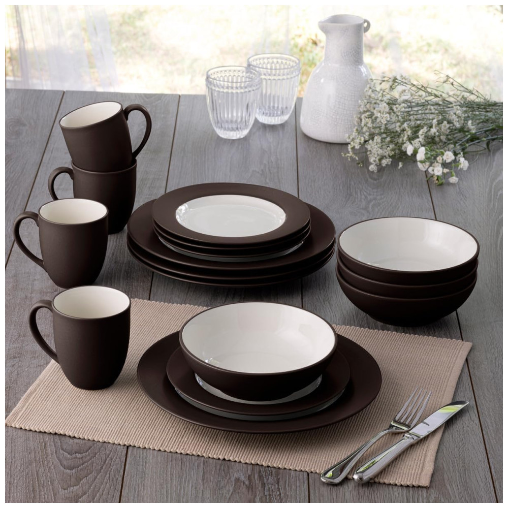 O conjunto Colorwave Chocolate de 16 peças serve 4 pessoas e inclui 4 pratos de jantar, 4 pratos de salada, 4 tigelas e 4 canecas, com esmalte marrom chocolate fosco e interiores em creme brilhante.