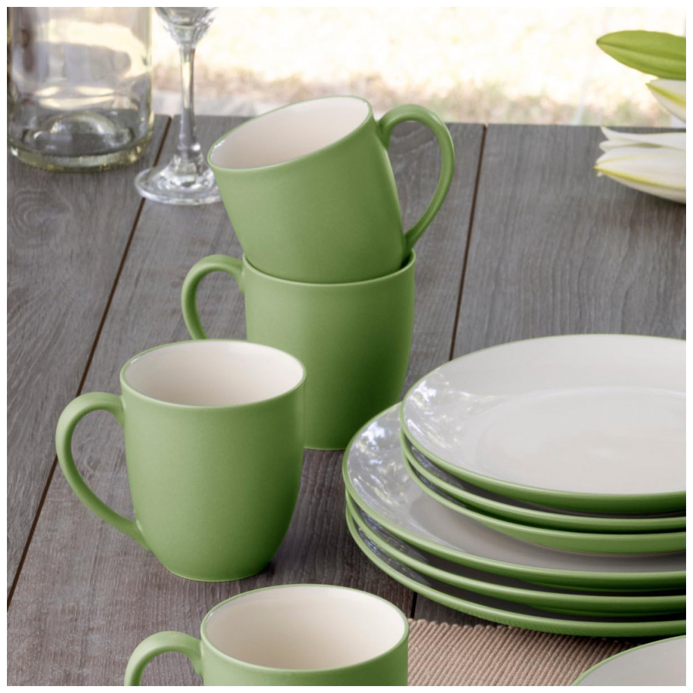 O conjunto Noritake Colorwave Apple de 16 peças serve 4 pessoas, com 4 pratos de jantar, 4 pratos de salada, 4 tigelas e 4 canecas em formato cupê, na cor verde maçã.