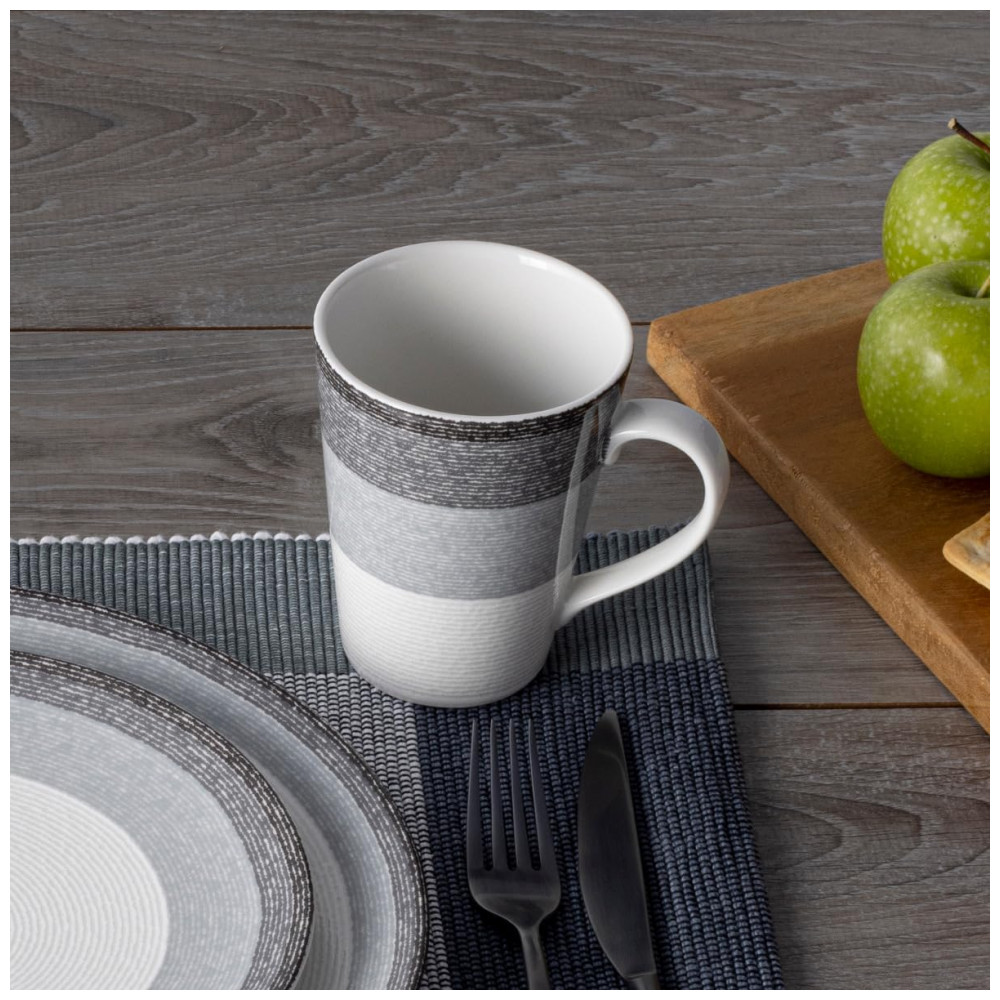 Este conjunto inclui um prato de jantar de 28 cm, um prato de salada/sobremesa de 21 cm, uma tigela de sopa/cereal de 15 cm e uma caneca de 355 ml, todos feitos de porcelana durável de alta qualidade.