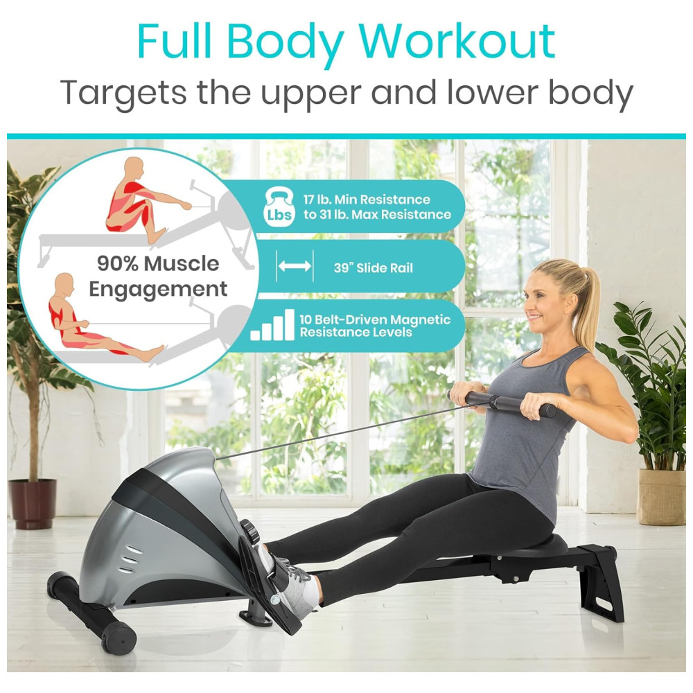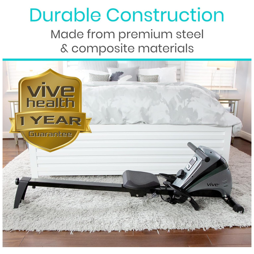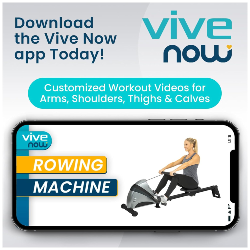 TREINO DE CORPO INTEIRO PERSONALIZADO Com dez níveis de resistência magnética suave, a máquina de remo Vive oferece exercícios cardio de baixo impacto que visam os braços, ombros, coxas e panturrilhas para um treino completo de corpo inteiro. A máquina de remo possui um trilho deslizante extra longo de 39 com assento ergonômico e antiderrapante e pedais giratórios e texturizados com alças ajustáveis para um ajuste durante qualquer treino.