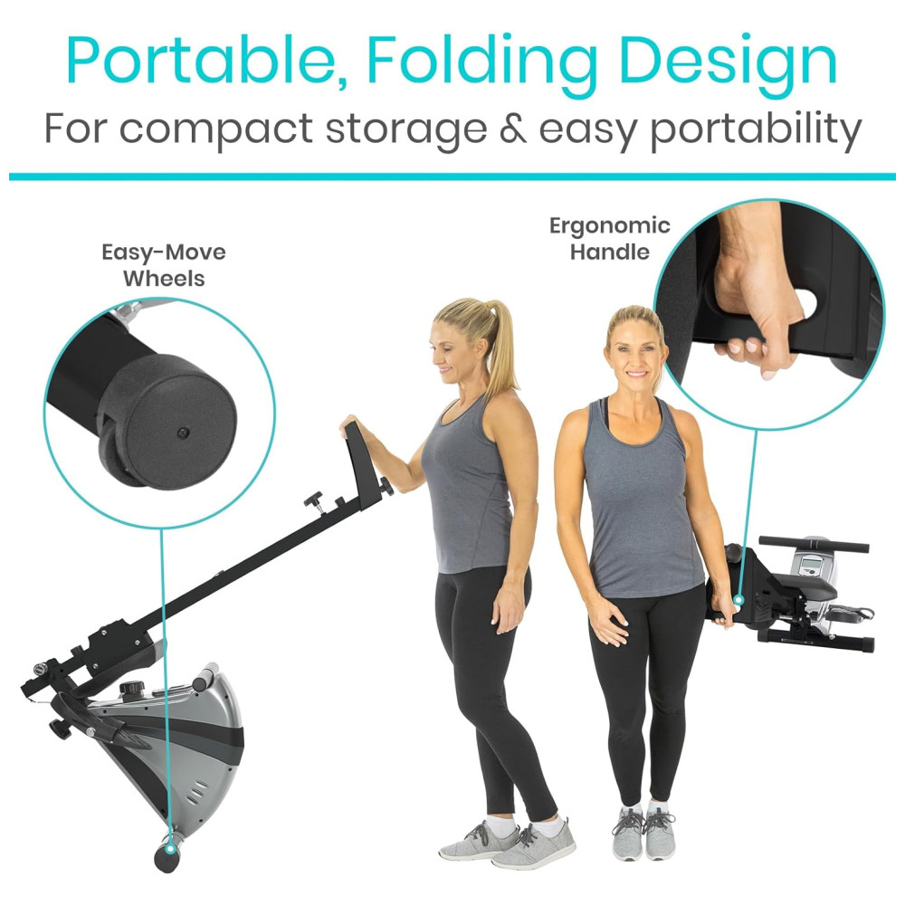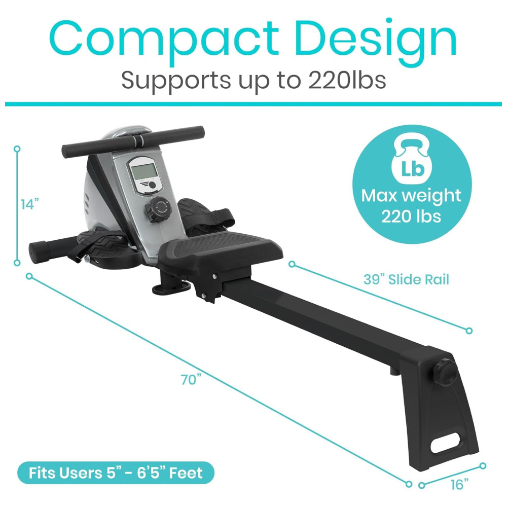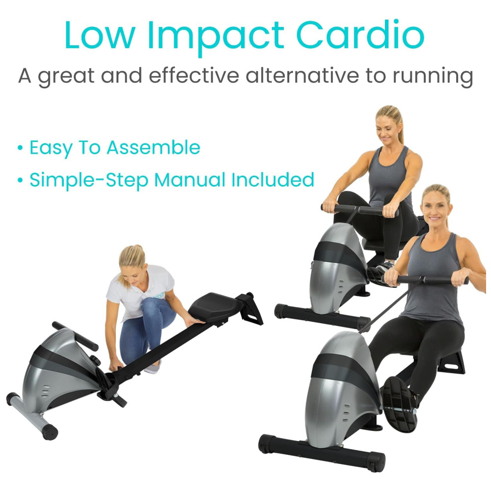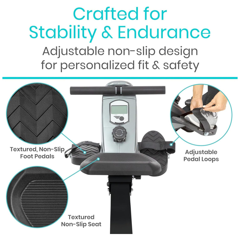 TREINO DE CORPO INTEIRO PERSONALIZADO Com dez níveis de resistência magnética suave, a máquina de remo Vive oferece exercícios cardio de baixo impacto que visam os braços, ombros, coxas e panturrilhas para um treino completo de corpo inteiro. A máquina de remo possui um trilho deslizante extra longo de 39 com assento ergonômico e antiderrapante e pedais giratórios e texturizados com alças ajustáveis para um ajuste durante qualquer treino.