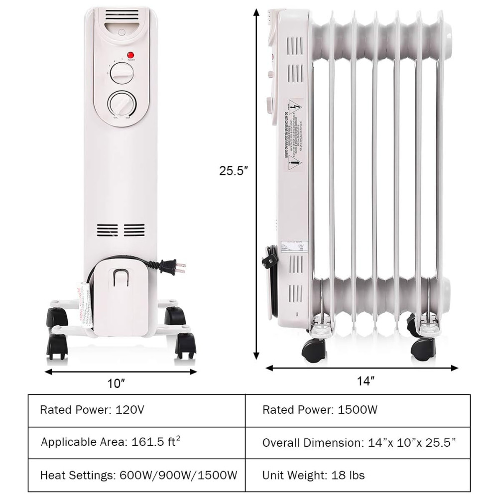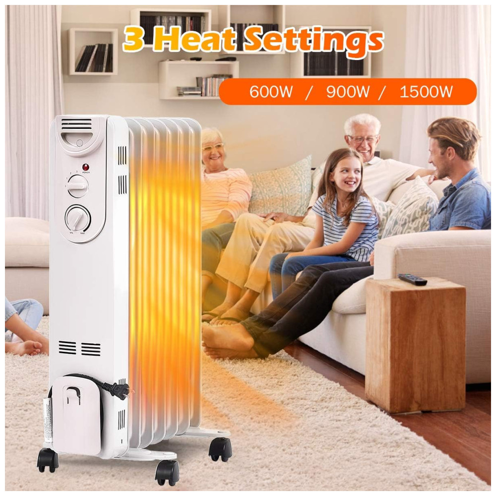 Aquecimento Eficiente e Termostato Ajustável: Com 7 aletas térmicas preenchidas com 1,8 kg de óleo, o aquecedor de radiador Tangkula oferece aquecimento eficiente para ambientes médios a grandes que precisam de calor constante no inverno. O aquecedor possui 3 configurações de calor (600W, 900W, 1500W) e termostato ajustável, permitindo personalizar a temperatura conforme suas necessidades de aquecimento.