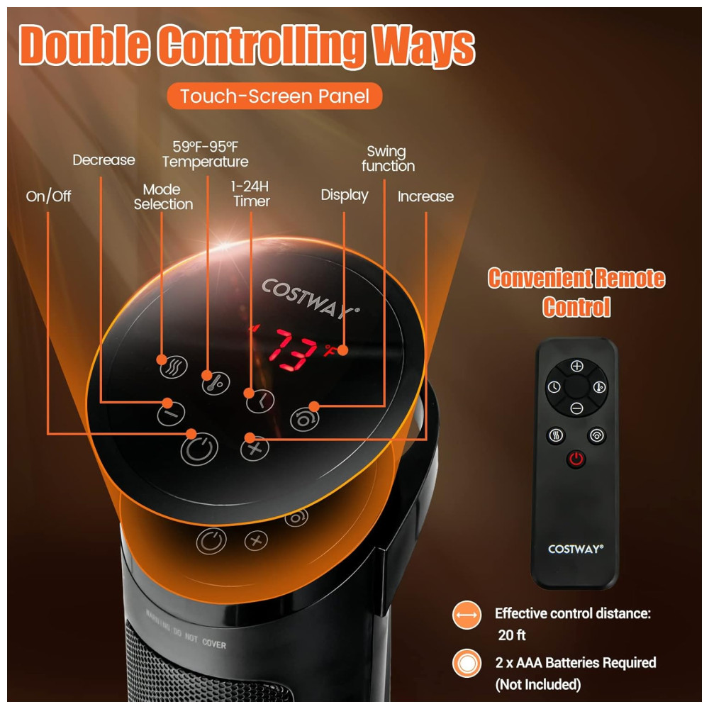 Controle por Painel e Controle Remoto: Este aquecedor PTC possui duas formas de controle: painel de controle sensível ao toque e controle remoto. Ambas as formas oferecem muita conveniência para configurar o timer, a função de oscilação, a temperatura e o modo de aquecimento. A distância efetiva do controle remoto é de até 6 m e são necessárias 2 pilhas AAA (não incluídas).