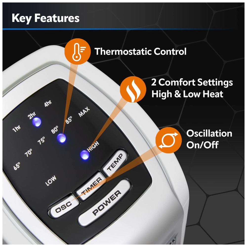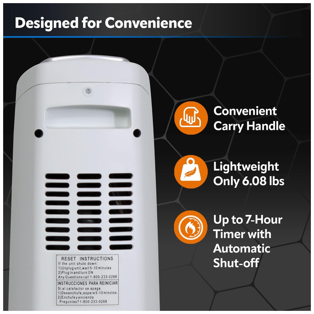 2 CONFIGURAÇÕES DE CALOR SILENCIOSAS – Oferece calor alto e baixo, além de um termostato ajustável. O timer automático desliga o aquecedor após até 7 horas.