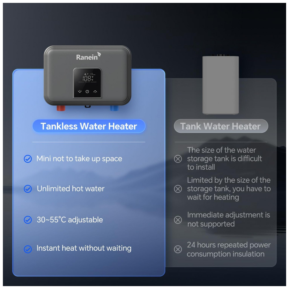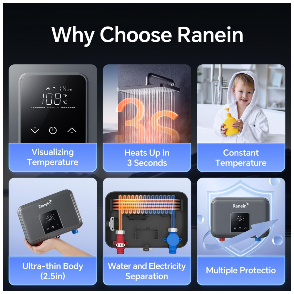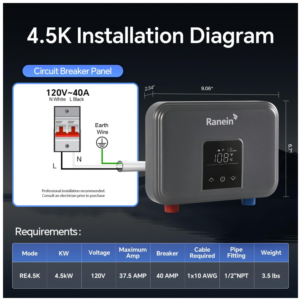 Este aquecedor de água elétrico tankless Ranein RE45K-120, com potência de 4.5 kW e 110V, fornece água aquecida sob demanda para uso pontual em banheiros, cozinhas ou lavatórios. Seu sistema de aquecimento instantâneo ativa-se conforme o fluxo de água, sem armazenamento ou perda de energia em standby, ideal para instalações sob pia com conexões de 1,27 cm NPT.
