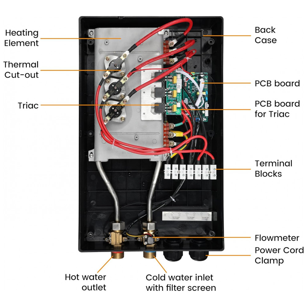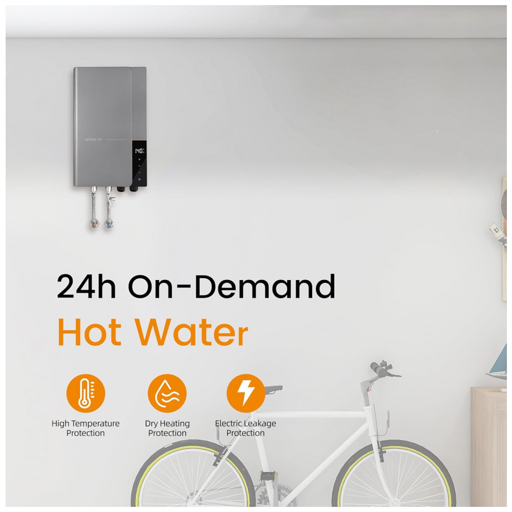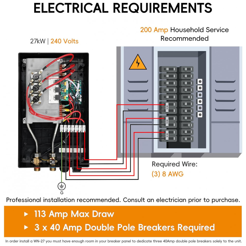 O aquecedor de água elétrico tanqueless WINTEMP WN27 27kW 240V fornece abastecimento contínuo de água quente para residências, com ajuste automático de consumo energético conforme temperatura de entrada e vazão. Projetado para até 2-4 pontos de uso simultâneos, como chuveiros residenciais, opera sob demanda sem tanque de armazenamento, com conexões de água em 3/4″ NPT e montagem vertical em parede. Exige instalação elétrica dedicada com 3 disjuntores duplos de 40A, fios 8/2 AWG com terra e painel de 250A recomendado.