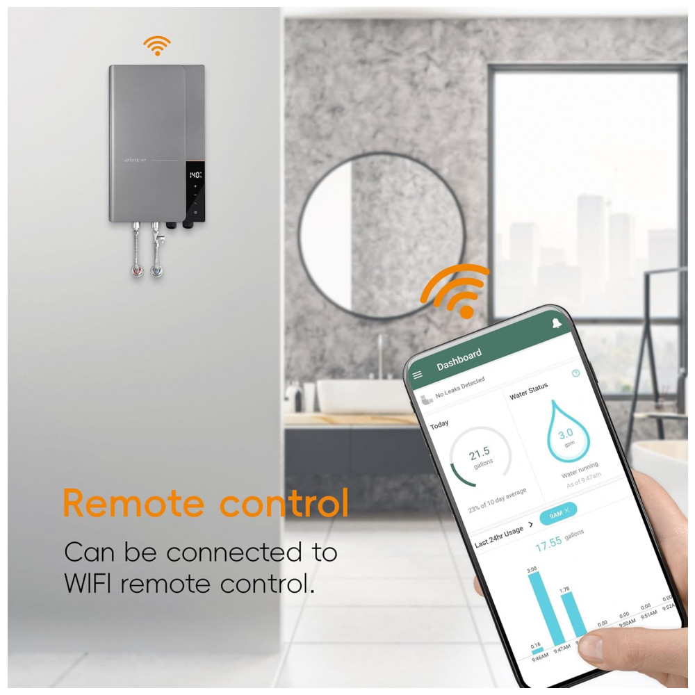 Tecnologia de auto-regulação ajusta potência em tempo real para vazão máxima de 24,6 L/min (6,5 GPM) e temperatura até 60°C. Display LED indica temperatura, com controle remoto via WiFi para ajustes à distância. Consumo zero quando inativo; eficiência térmica otimizada para múltiplos usos residenciais.