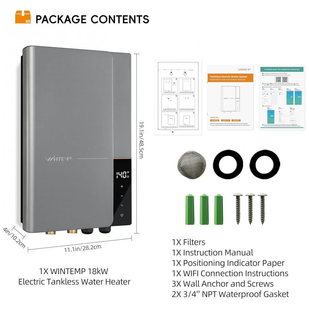 Aquecedor de Água Instantâneo sem Tanque WINTEMP Cinza 18 kW com Display LED WiFi e Proteção contra Sobreaquecimento WT‑WN18K 240V