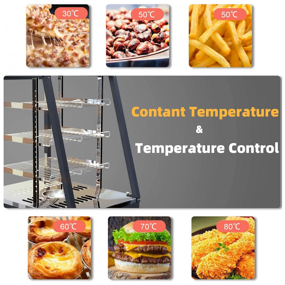 O Aquecedor de Alimentos 2 Andares Commercial é um expositor countertop projetado para cozinhas profissionais, com corpo em aço inoxidável anticorrosivo e porta de vidro curvo temperado para visualização clara de conteúdos. Oferece 2 prateleiras em material food-grade com volume interno de 42,5 L, suportando itens como pizzas, tortas de ovo e hambúrgueres em configurações ajustáveis. O termostato homogêneo permite controle preciso na faixa de 30°C a 85°C, garantindo distribuição uniforme de calor.