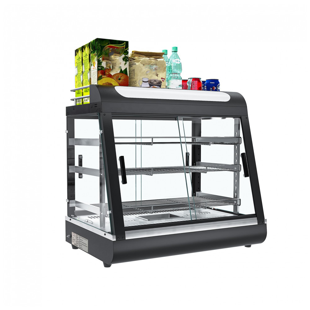 Equipado com iluminação LED tri-cor (quente, branca e fria) nas laterais e superior, os componentes isolados dissipam calor internamente enquanto iluminam conteúdos como pretzels, sanduíches, brownies, massas folhadas e tortas. Portas deslizantes frontais e traseiras em vidro temperado facilitam autoatendimento em cafeterias, restaurantes e cozinhas. Potência de 1200W suporta operação contínua em ambientes de médio fluxo.