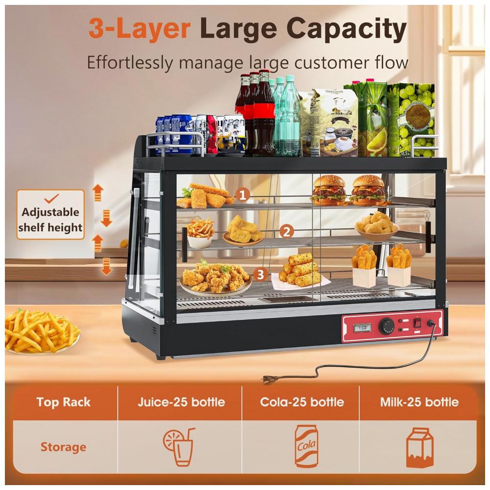 O Aquecedor de Alimentos Countertop Whalefall é um gabinete térmico comercial de 89 cm de comprimento com estrutura em aço inoxidável e vidro temperado em todas as faces, projetado para exibição multi-nível. Dispõe de 3 bandejas ajustáveis e suporte superior com capacidade para 10-20 garrafas de leite ou suco (até 30 kg), otimizando armazenamento em espaços compactos. O termostato ajustável opera na faixa de 21°C a 85°C com exibição em tempo real via knob dedicado e termômetro integrado.