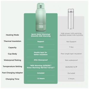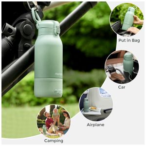 Com o Aquecedor de Leite Portátil da Momcozy, você pode alternar facilmente entre os modos de aquecimento para leite materno e água, garantindo a temperatura perfeita para a alimentação, seja para preparar fórmulas ou aquecer leite. Este aquecedor portátil aquece a água para 40°C em apenas 3 minutos e o leite refrigerado para 37°C em 5 minutos, assegurando que o leite do seu bebê esteja sempre pronto. Com capacidade de 17 onças, é ideal para famílias com múltiplos bebês. Leve e fácil de transportar, com design de garrafa térmica que não vaza leite materno, este é o companheiro de viagem perfeito para famílias com recém-nascidos. A bateria de longa duração permite aquecer água até 24 vezes ou leite até 8 vezes com uma única carga. Desfrute da liberdade do design sem fio, perfeito para aquecer mamadeiras em qualquer lugar, sem a necessidade de uma tomada. O carregamento rápido em apenas 1,5 horas significa que você está sempre pronto para sair.