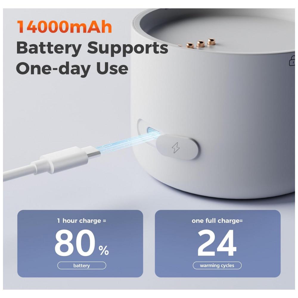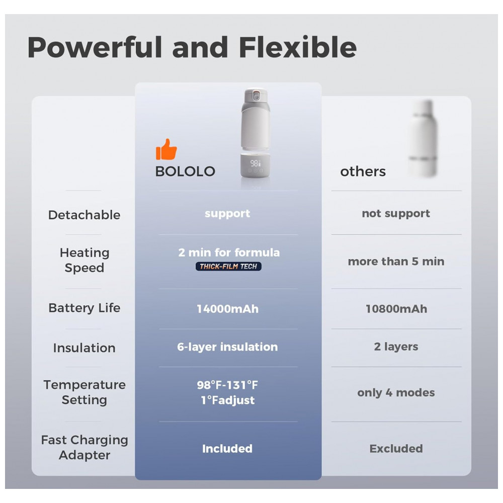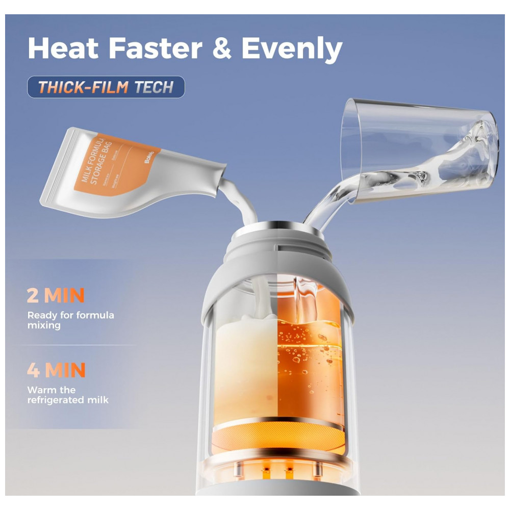 Comparado com os aquecedores de mamadeira portáteis de uma peça, o design destacável do Aquecedor de Leite BOLOLO facilita a limpeza e manutenção das mamães, evitando a entrada acidental de água na base durante a limpeza. Com tecnologia avançada de aquecimento de película espessa, aquece a água em apenas 2 minutos e o leite materno refrigerado em 4 minutos, garantindo que seu bebê possa desfrutar rapidamente de água ou leite materno na temperatura ideal para viagens. Equipado com uma bateria grande de 14,000mAh e longa vida útil, o Aquecedor de Leite BOLOLO pode aquecer 150ml de água até 16 vezes ou o mesmo volume de leite materno até 10 vezes em uma única carga completa, atendendo às suas necessidades de alimentação ao longo do dia. Com capacidade máxima de 493ml, é ideal para famílias com múltiplos bebês. Sem fio e compatível, este aquecedor torna mais fácil preparar leite quente para seu bebê a qualquer momento, em qualquer lugar, proporcionando uma experiência de alimentação sem complicações. O que você recebe: Aquecedor de Leite Portátil Pro BOLOLO, carregador rápido de 30W, cabo tipo C, manual do usuário.