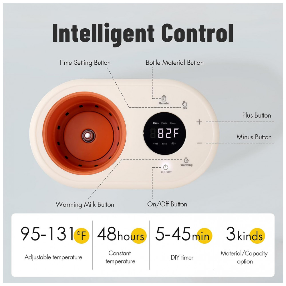 Além de ser um aquecedor de garrafas, ele possui funções adicionais, como descongelar sacos de zenamento de leite, aquecer bebidas embaladas, manter bebidas quentes e aquecer alimentos complementares. Seu grande calibre de 7 centímetros atende às necessidades de várias especificações.