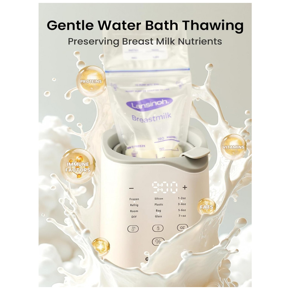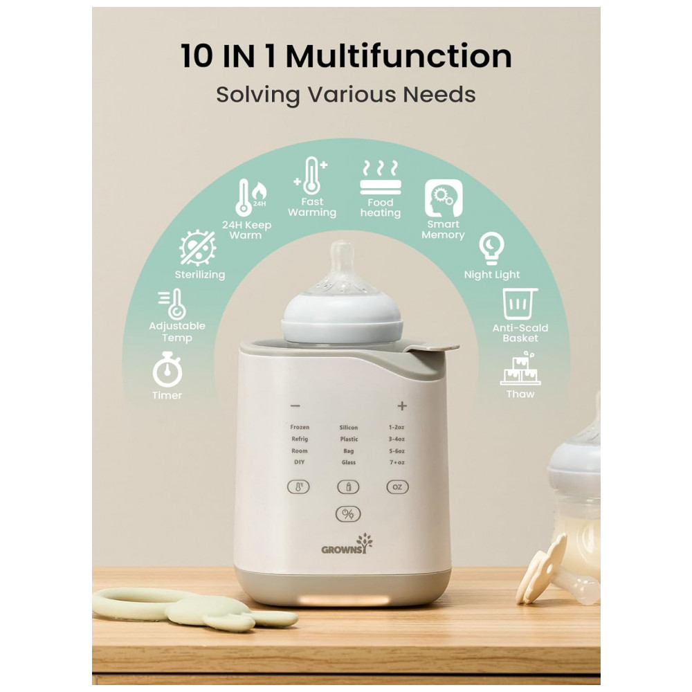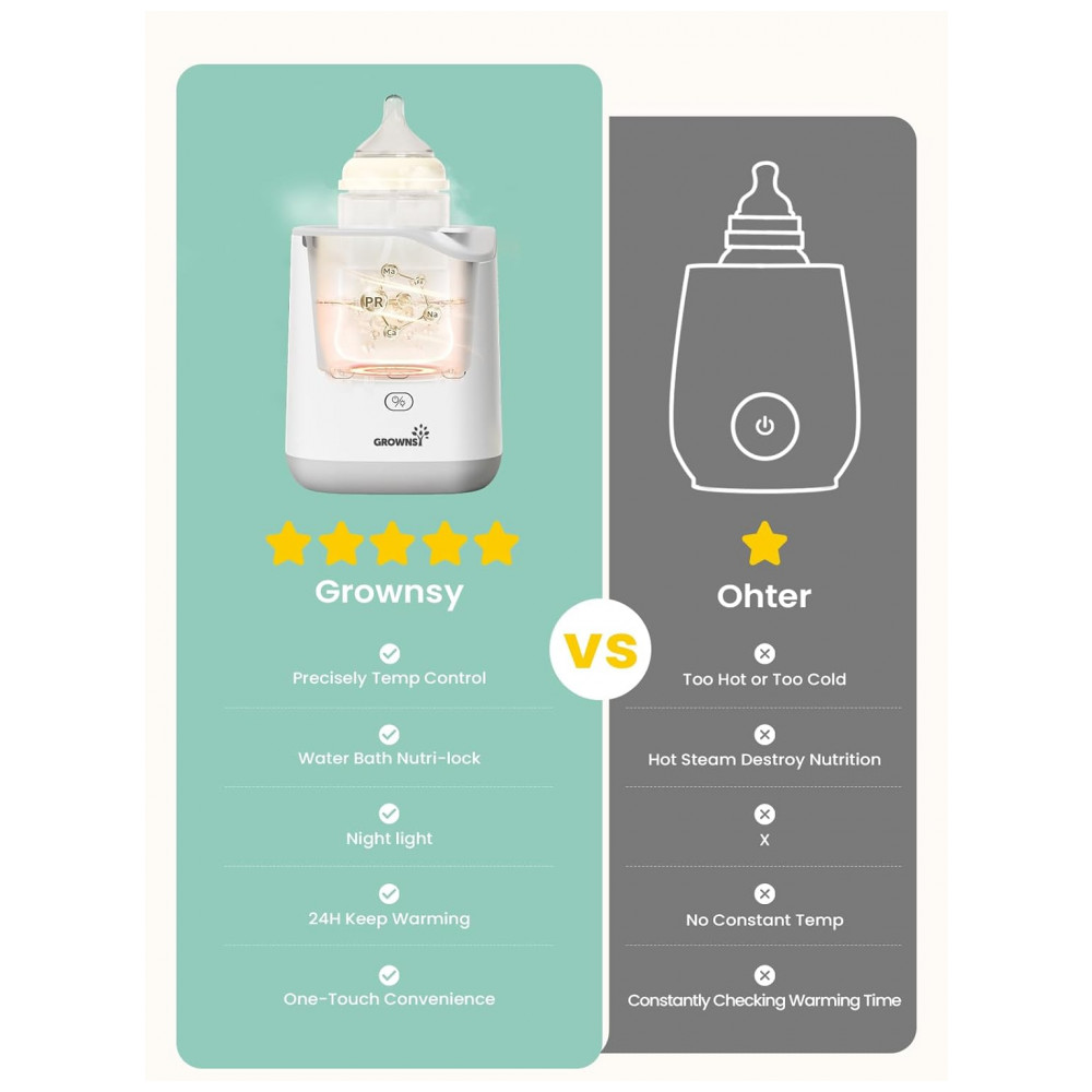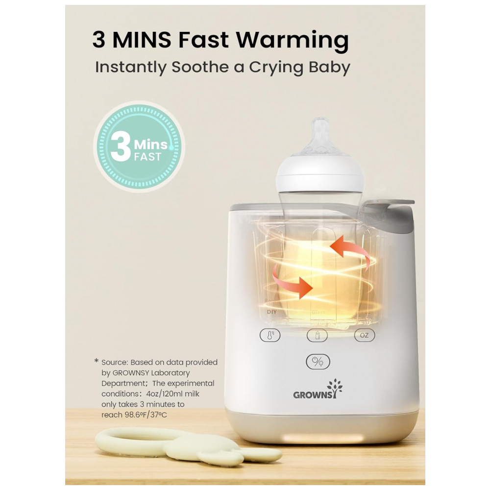 O Aquecedor de Mamadeira modelo 2025 da GROWNSY aquece 120ml de leite a 37°C em apenas 35 minutos. Diga adeus às esperas longas e acalme rapidamente seu bebê faminto, especialmente durante as mamadas da meia-noite. Com sistema de circulação de água suave, mantém o leite em uma temperatura semelhante ao leite materno, auxiliando na digestão e preservando os nutrientes. Possui função de pré-aquecimento inteligente e precisa, facilitando aos pais preparar o leite na temperatura ideal para os bebês. Conta com luz noturna conveniente para facilitar as mamadas durante a noite. Além disso, o aquecedor multifuncional aquece rapidamente, descongela, aquece alimentos, esteriliza, possui timer de 24 horas, temperatura ajustável, cesto antiescaldo e memória inteligente. Adequado para todos os tipos de mamadeiras e materiais, aquece mamadeiras e alimentos para bebês de forma segura e uniforme. Escolha de milhões de mães, premiado como Melhor Aquecedor de Mamadeiras pela ABC Kids Expo Awards. Um presente perfeito para cuidar de quem você ama, e deixe a Grownsy cuidar do resto.
