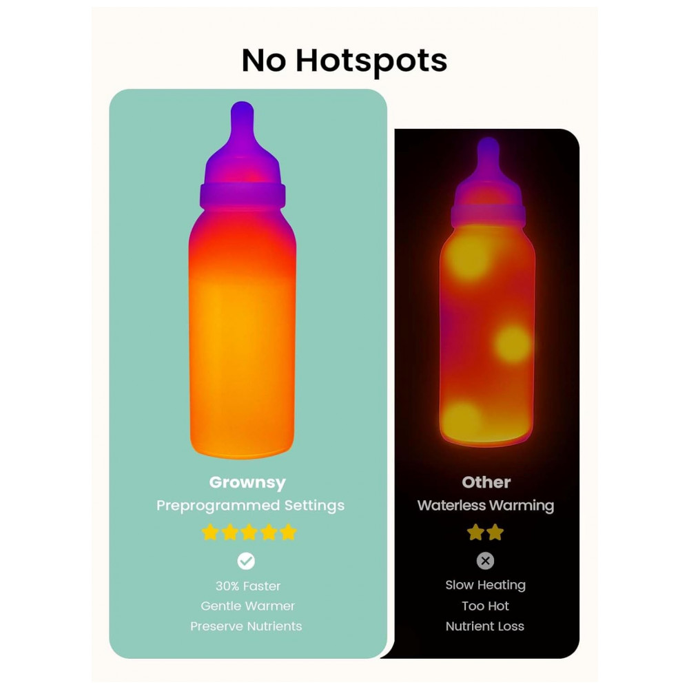 Aqueça rapidamente leite materno e fórmula do frio à temperatura ideal de alimentação em minutos com o Aquecedor de Mamadeira GROWNSY. Soothe seu bebê faminto rapidamente e traga de volta o sorriso! Adeus às esperas longas e aos bebês chorando. Esqueça os antigos aquecedores de leite – com este inteligente aquecedor, basta inserir o material da mamadeira, a quantidade de leite e a temperatura inicial, e ele funcionará automaticamente. Seu assistente de aquecimento de leite está pronto para funcionar – por que não levá-lo para casa agora? Facilitando as Mamadas Noturnas – o companheiro definitivo para noites exaustivas. Diga adeus ao incômodo de aquecer água à meia-noite, com operação silenciosa. Preserve os Nutrientes do Leite Materno – o aquecedor de mamadeira utiliza circulação de água suave, evitando superaquecimento e mantendo o sabor original e nutrientes essenciais. Escolha de Milhões de Mães – escolhido por mais de 9.000.000 de pais, o aquecedor de mamadeira Grownsy está comprometido em cuidar e nutrir cada etapa do crescimento. Adicione à sua lista de presentes ou presenteie alguém especial, e deixe Grownsy cuidar do resto.