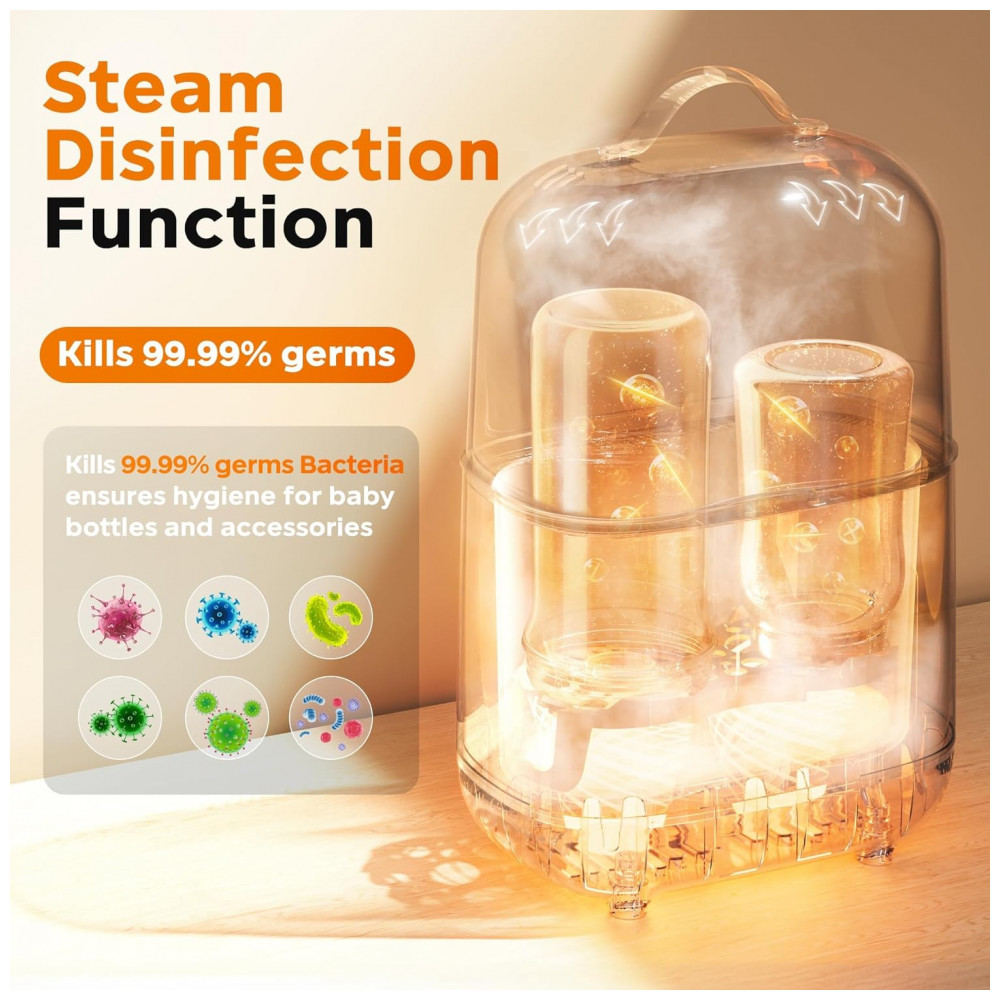 Aquecimento Rápido! Aqueça o leite em apenas 37 minutos, garantindo uma alimentação rápida para acalmar seu bebê e evitar choros. Sua capacidade de aquecimento rápido é especialmente útil para acalmar um bebê chorando durante despertares noturnos. O tempo de aquecimento depende do volume do leite, da temperatura inicial e do material da mamadeira. O Aquecedor de Mamadeira oferece diversas funções, incluindo Aquecimento Rápido, Mantém Quente por 24 Horas, Esterilização, Aquecimento de Alimentos, Descongelamento e Aquecimento Constante. Ideal para trazer leite materno ou fórmula à temperatura corporal sem superaquecer, preservando os nutrientes essenciais para uma nutrição ótima. Uso Eficiente de Vapor! Utilize vapor de alta temperatura para manter mamadeiras e potes de comida para bebê limpos, garantindo higiene ótima. Pode vaporizar vários bicos e mamadeiras simultaneamente, aprimorando a saúde e segurança do seu bebê. Alimentações Noturnas Convenientes! Utilize a função Mantém Quente para manter a temperatura do leite para alimentações sem complicações durante a noite. O tamanho compacto adapta-se facilmente a um criado-mudo e é perfeito para tentativas frequentes de mamadeira com intervalos curtos. Design Inclusivo! Apresenta um design de dupla mamadeira compatível com a maioria das marcas e tipos de mamadeiras. A tela de controle LCD intuitiva garante facilidade de uso, enquanto o recurso de Desligamento Automático aprimora a segurança. É um excelente presente para chá de bebê, com sua funcionalidade excepcional e design amigável ao usuário.