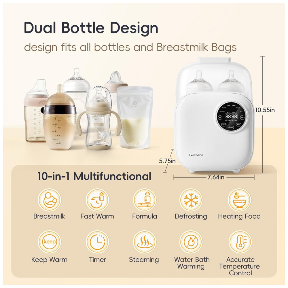 Fácil de usar, rápido aquecimento, controle preciso de temperatura, descongelamento, aquecimento de leite materno, aquecimento de fórmula, timer, aquecimento mantido, vaporização de alimentos, aquecimento em banho-maria. Multi funcionalidade, tudo em um com um toque inteligente. Este aquecedor de leite materno de estética alta é uma escolha prática para as mamães modernas. Aquecimento Rápido e Inteligente! Pronto em apenas 35 minutos! Aquece 120ml de leite a temperatura do leite materno. Solução útil para bebês famintos, transformando choros em refeições felizes instantaneamente! Com Controle Preciso de Temperatura de 1°C, sem pontos quentes, sem perda de nutrientes, garantindo aquecimento seguro e suave para leite materno, fórmula infantil e sacos de armazenamento de leite. Operação com Uma Mão, Ideal para Mamães Ocupadas! Nosso aquecedor de fórmula pode ser operado com uma mão, permitindo o descongelamento fácil de leite materno congelado e ajuste de temperatura enquanto segura seu bebê. Economize tempo valioso para aliviar a carga de trabalho das mamães. Ótimo para alimentações rápidas durante pausas em conferências ou momentos tranquilizadores noturnos. Auxiliar Prático para Novos Pais! Função de aquecimento mantido automático com timer, operação silenciosa ideal para alimentações noturnas. O aquecedor de mamadeira duplo, projetado para gêmeos e famílias com múltiplos filhos, possui um tanque de água de grande capacidade de 600ml e ampla abertura, permitindo o aquecimento simultâneo de leite materno e fórmula, tornando-o um produto essencial para alimentação infantil em lares com múltiplas crianças. Compatível com a Maioria das Mamadeiras e Potes de Comida Padrão! O aquecedor de mamadeira rápido usa vapor a 100°C para limpeza profunda de mamadeiras e potes de comida para bebês. Também pode aquecer e manter diversas papinhas aquecidas para bebês e mamães. O aquecedor de mamadeira portátil é ótimo para presentes de recém-nascidos e é um favorito em chás de bebê! Segurança Alimentar de Grau Alimentício! Projetado como um aquecedor de leite duplo para bebês, feito de material de grau alimentício e equipado com proteção contra queima a seco, garantindo uso seguro. Proporcionando uma barreira nutritiva para o seu bebê e tranquilidade a cada alimentação. Fácil de Limpar! Projetado com pais e cuidadores ocupados em mente, este aquecedor de mamadeira possui uma tampa de aquecimento inferior removível que permite limpeza fácil em apenas 30 segundos. Diga adeus ao tártaro escondido e permita que cada criança prospere em um ambiente amoroso. Aquecedor de Mamadeira, Aquecedor de Mamadeira para Bebê, Aquecedor de Mamadeira para Leite Materno, Aquecedor de Mamadeira Duplo, Aquecedor de Mamadeira Duplo para Gêmeos