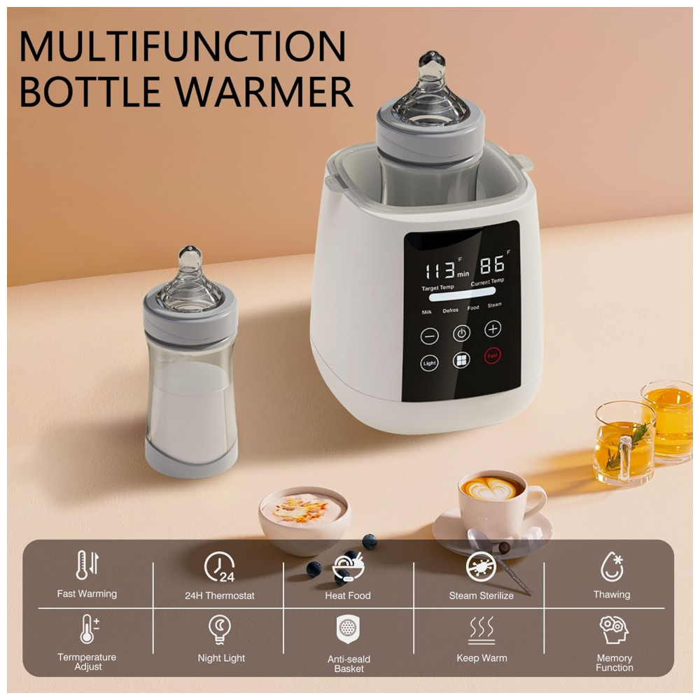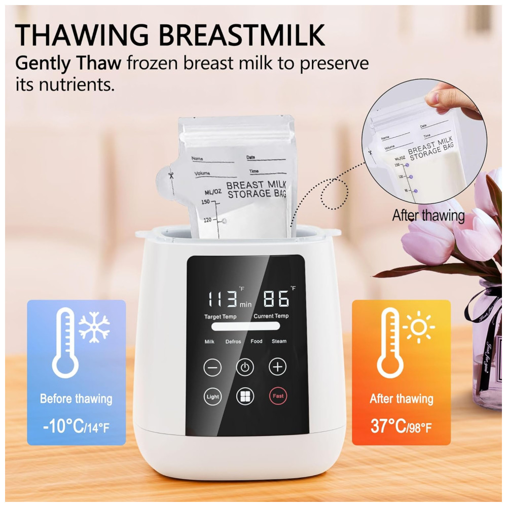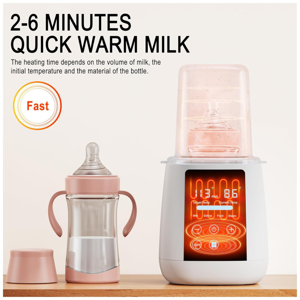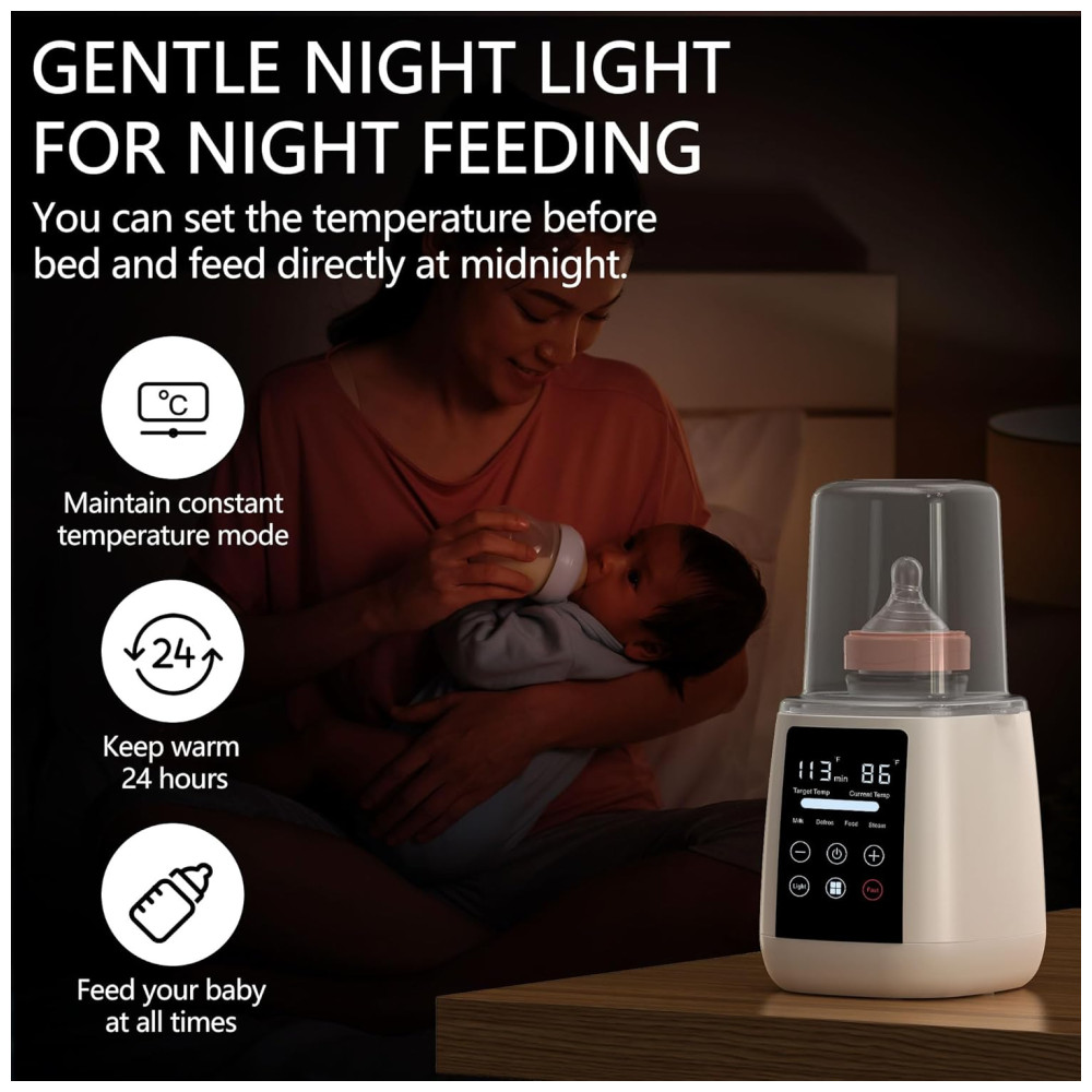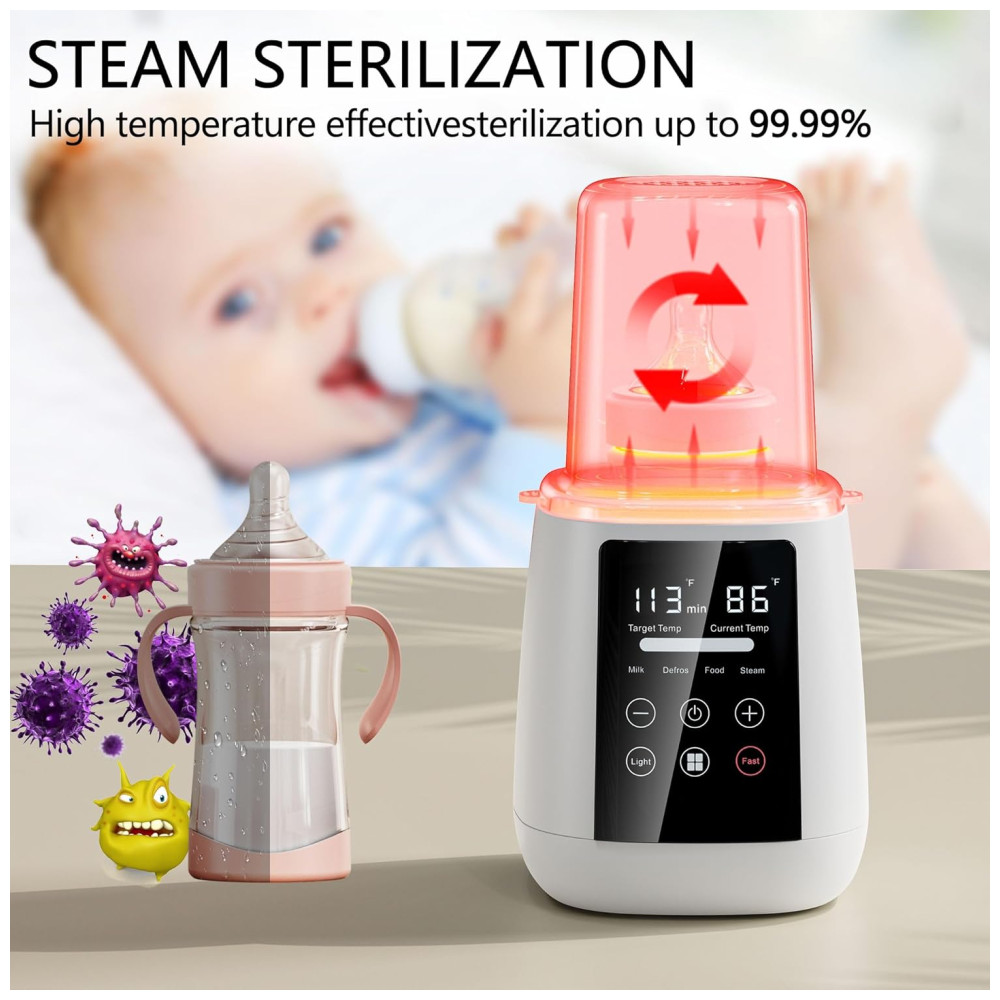 Aquecedor de mamadeira rápido para bebês O aquecedor de mamadeiras Goard leva apenas 3 a 6 minutos para aquecer o leite materno, o leite em pó, o leite em mamadeira, descongelar sacos congelados e aquecer potes de alimentos. Use rapidamente para acalmar bebês famintos. O aquecedor de mamadeiras compacto Goard torna a vida mais fácil. Aquecedor de mamadeiras multifuncional, aquecimento rápido, termostato 48H, jarra de alimentos para aquecimento, esterilização a vapor, descongelamento, ajuste de temperatura, luz noturna, cesta anti selagem, manter aquecido, para a maioria das marcas de mamadeiras. Um aquecedor de leite inteligente essencial para alimentação no meio da noite. O aquecedor de mamadeira Nutri Milk Warmer Goard aquece o leite materno por meio de uma tecnologia suave de banho maria para evitar o superaquecimento, preservar os nutrientes e o sabor necessário para a digestão e o crescimento do bebê. Desfrute de uma experiência de alimentação natural. Função de vapor Aquecedor e esterilizador de mamadeiras inteligente, função de vapor integrada, esterilização eficaz em alta temperatura de até 99,99. É adequado para desinfecção de chupetas, partes de mamadeiras e chupetas para tornar a alimentação mais higiênica. Luz noturna suave para alimentação silenciosa Comparado com outras marcas, o aquecedor de leite Goard adiciona um design de luz noturna e um painel de operação claramente digital para facilitar o aquecimento do leite à noite. Que você e seu bebê tenham um bom sono