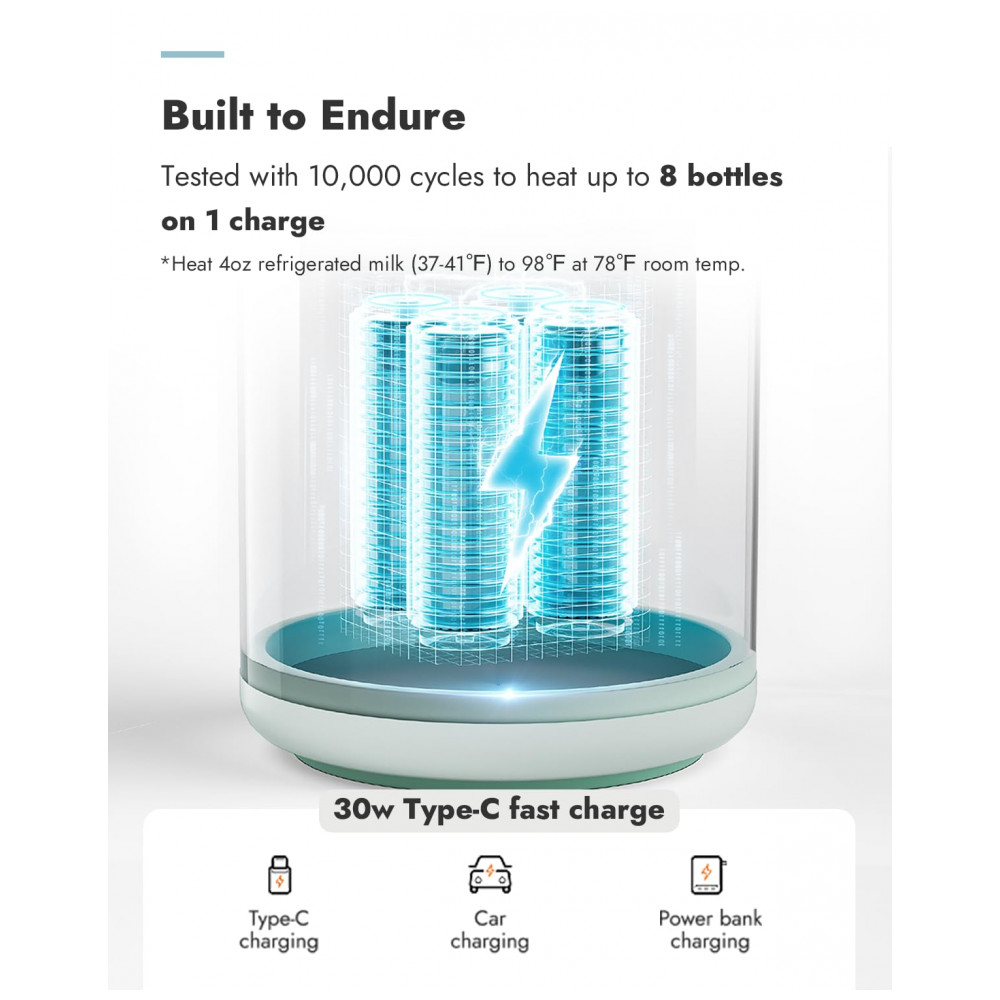 Desfrute de aquecimento 30% mais rápido com o Aquecedor de Mamadeira Papablic, capaz de aquecer 120ml de leite refrigerado a 37°C em 3 minutos e 50 segundos, e 120ml de água em temperatura ambiente a 40°C em 2 minutos e 10 segundos. Chega de esperar! Ideal para viagens, passeios ou noites tardias, garantindo temperaturas perfeitas rapidamente. O primeiro aquecedor de leite portátil do mundo com esterilizador integrado, mantendo a higiene sem necessidade de ferramentas extras. Fabricado em aço inoxidável de grau alimentício, seguro para leite materno e fórmula infantil. Com boca larga de 8cm para facilitar a limpeza e grande capacidade. Design fino que se encaixa confortavelmente na mão, porta-copos de carro e bolsas de fraldas, tornando-se essencial para alimentar seu bebê em movimento. Bateria de longa duração 30% mais duradoura. Uma carga completa aquece 6 a 8 porções de 120ml de leite refrigerado, cobrindo as necessidades diárias de alimentação. Com carregamento rápido de 30W, fica totalmente recarregado em menos de 2 horas. Escolha entre 5 configurações de temperatura para manter o leite na temperatura ideal por até 4 horas, perfeito para as noites com seu aquecedor portátil.