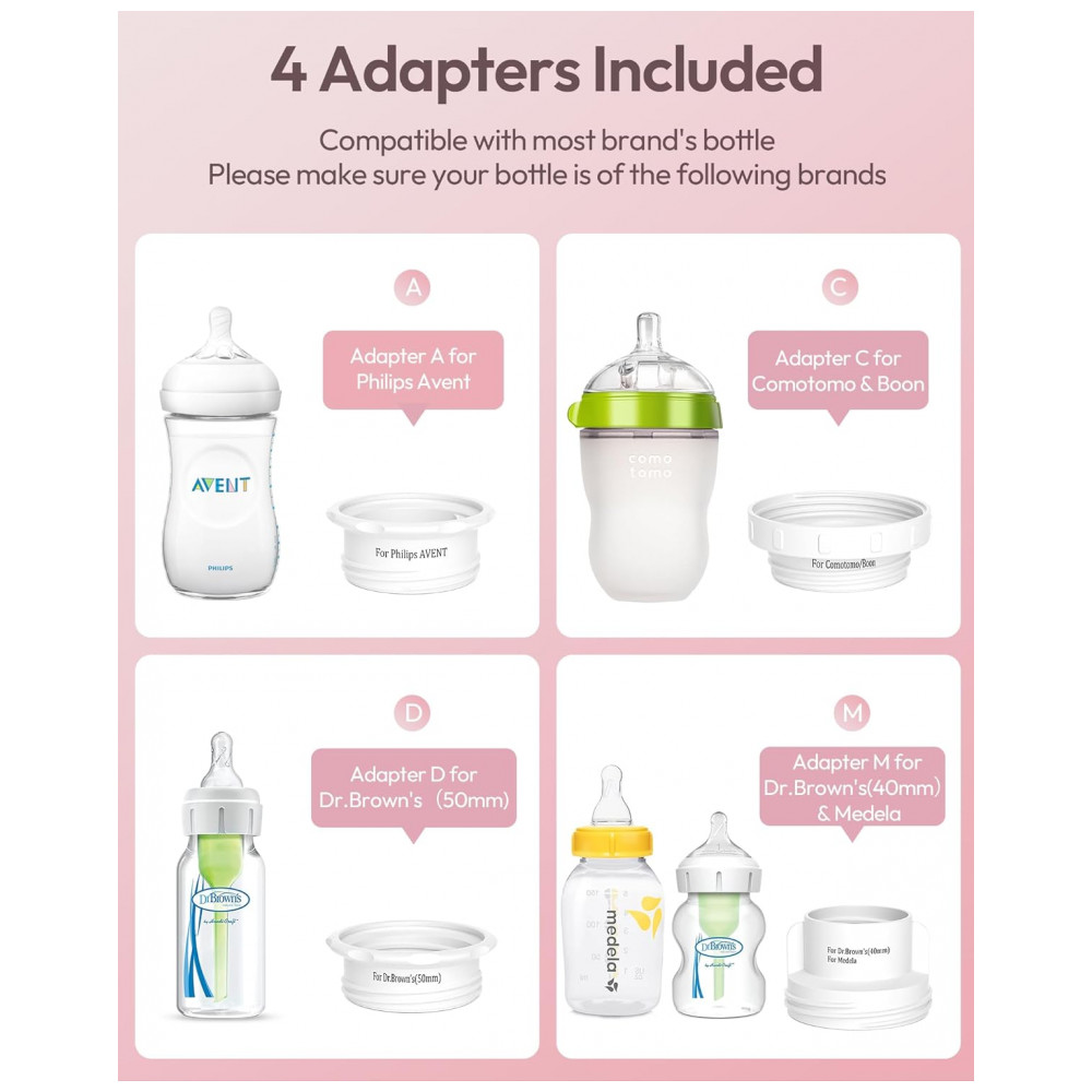 Garrafa de vidro e 4 adaptadores incluídos: O aquecedor de mamadeiras atualizado inclui uma garrafa de vidro e quatro adaptadores à prova de vazamentos que cabem na maioria das garrafas. Esses adaptadores são compatíveis com Dr. Brown 5 centímetros, Dr. Brown Medela 4 centímetros, AVENT 5 centímetros e Comotomo Boon 7 centímetros. Você pode selecionar o adaptador apropriado de acordo com as instruções ou usar o frasco de vidro incluído sem adaptador se o adequado não for encontrado.