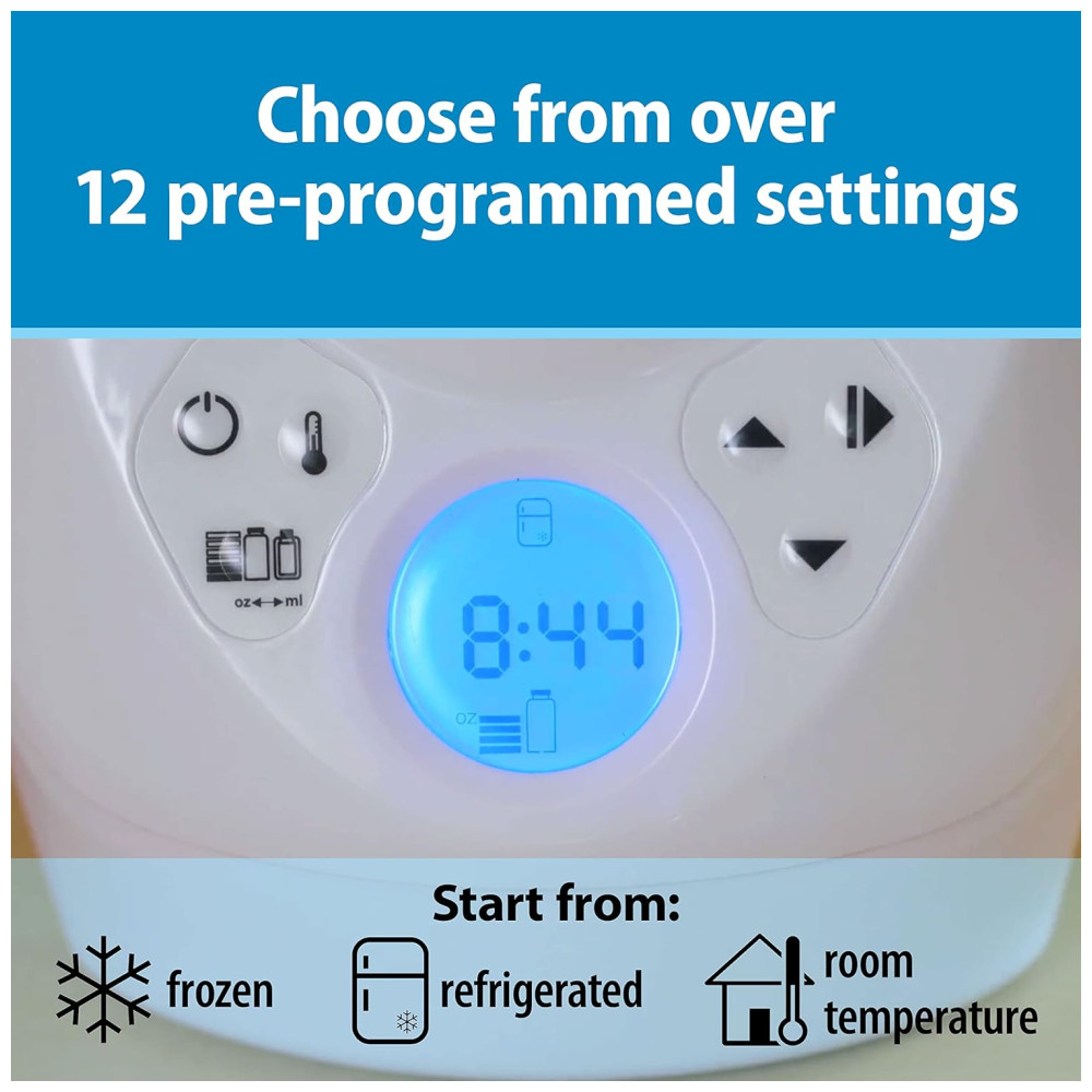 AQUECIMENTO RÁPIDO. Acalme o bebê agitado com um aquecimento rápido, uniforme e consistente da mamadeira. Do frio à temperatura corporal em apenas 2 minutos.