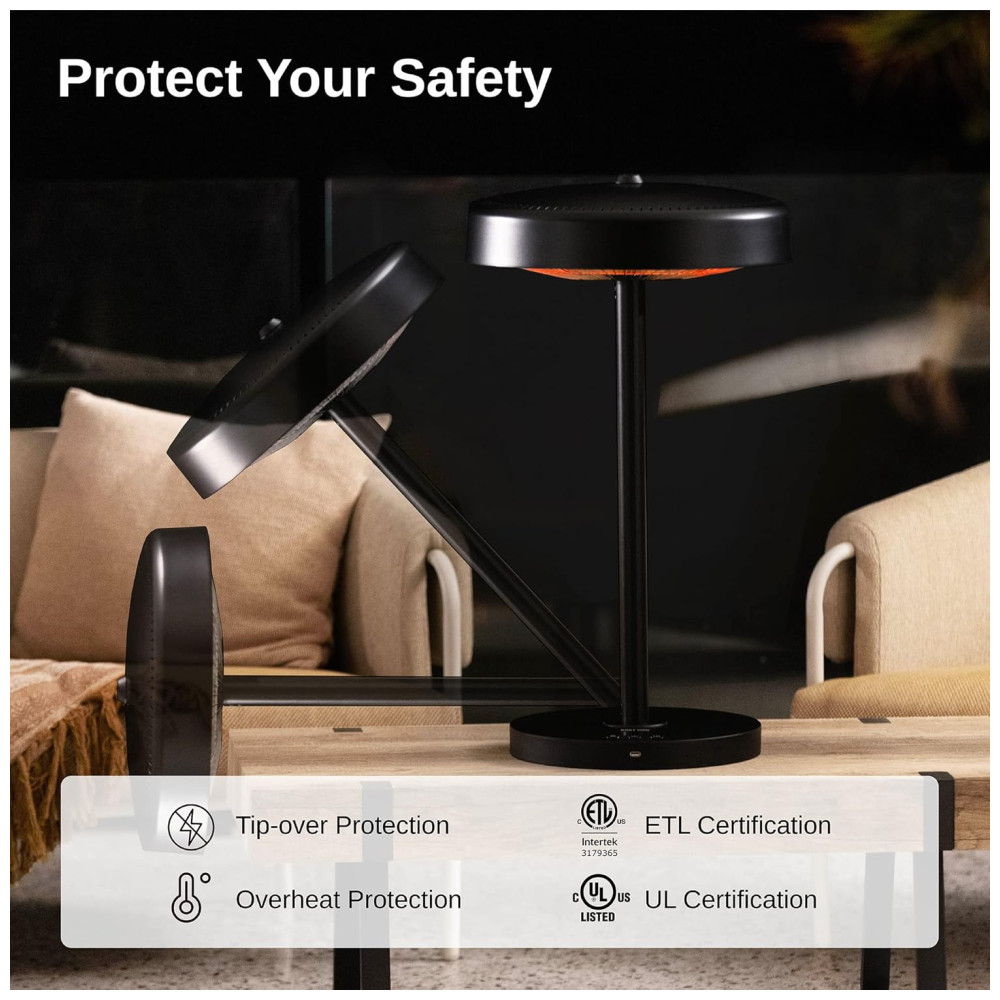 O aquecedor infravermelho EAST OAK possui certificação IP65 para impermeabilização e proteção contra poeira, além de uma base antiderrapante para garantir o uso normal em condições adversas. Com aprovação na certificação ETL e UL, este aquecedor de pátio é seguro e estável. Verifique todas as peças do aquecedor antes de usá-lo e consulte o manual para obter informações de contato do fabricante em caso de dúvidas ou problemas.