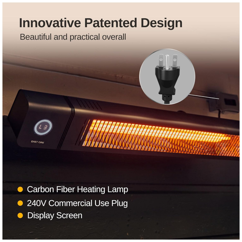Este aquecedor de pátio comercial da EAST OAK é projetado para uso em ambientes externos, com uma área de aquecimento de quase 12m2 e um ângulo de aquecimento de 45 graus. Ele possui três configurações de aquecimento 2000W, 2400W, 3000W e um temporizador de 24 horas que pode ser controlado remotamente.