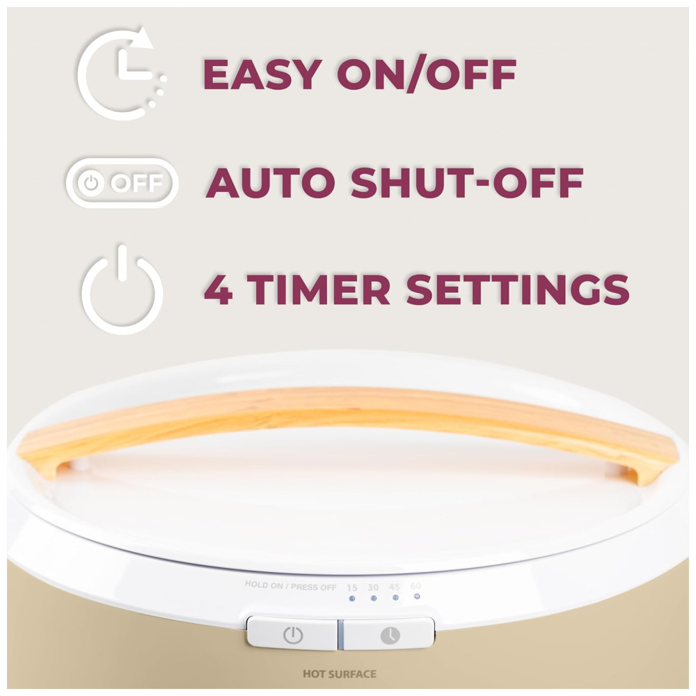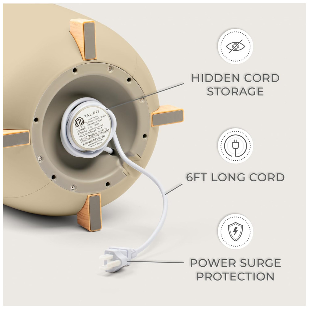 O aquecedor oferece quatro configurações de temporizador para aquecer suas toalhas por 15, 30, 45 ou 60 minutos antes de desligar automaticamente, garantindo que suas toalhas estejam sempre quentes e confortáveis no momento certo. A base do aquecedor inclui armazenamento integrado para o cabo, mantendo tudo organizado quando não estiver em uso.