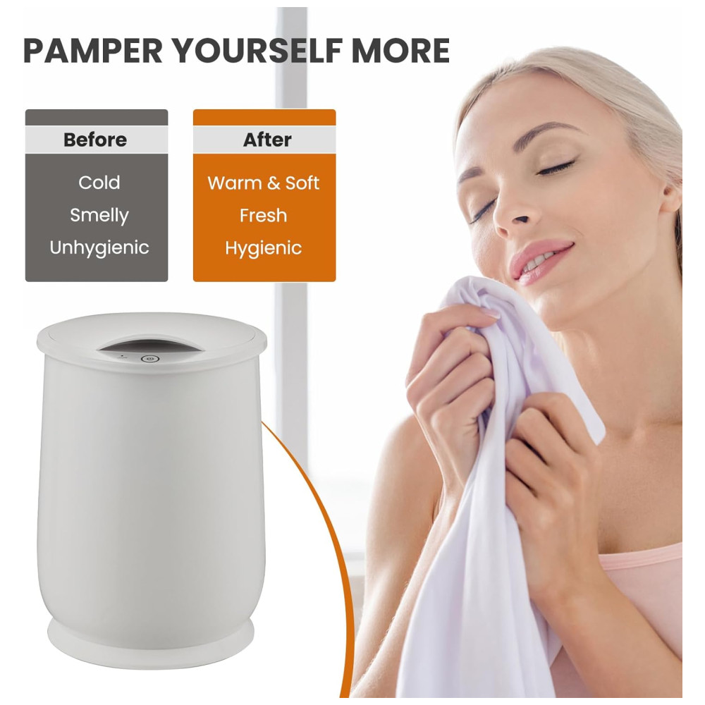 Personalize sua fragrância Exceto para manter toalhas, cobertores e até roupas quentes e aconchegantes, o aquecedor elétrico de toalhas WELLHUT spa também as mantém limpas e higiênicas. Além disso, o porta fragrância equipado também mantém as toalhas frescas e com um cheiro melhor. Com alça embutida, a tampa superior invertida oferece conveniência para abrir e fechar o aquecedor de toalha de balde.