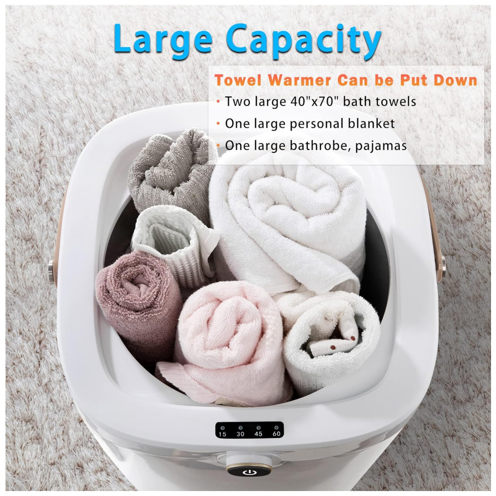 EXPERIÊNCIA DE SPA LUXUOSA Desfrute de uma experiência de spa luxuosa com o aquecedor de toalhas. Nosso balde de grande capacidade aquece toalhas, roupões de banho e cobertores grandes em apenas 10 minutos, proporcionando calor e conforto máximo.