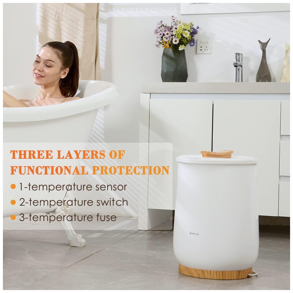 Aquecimento rápido Oferece aquecimento rápido em apenas 1 minuto e atinge alta temperatura em apenas 6 minutos. Este aquecedor de toalha de balde de luxo é controle de botão único, até 60 minutos de tempo de aquecimento. Design decente, operação fácil como uma brisa. Mantenha as toalhas quentes e aconchegantes o tempo todo. Esteja você tomando um banho rápido ou um banho longo e relaxante, o aquecedor atende a todas as suas necessidades, use o com mais confiança.