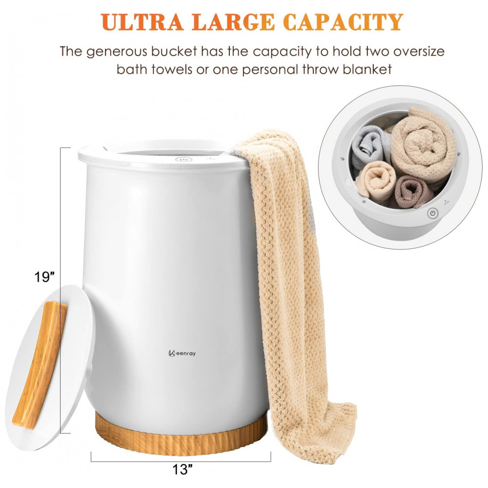 Capacidade extra grande Aquecedores de toalha de balde ultra grandes para banheiro, acomoda até duas toalhas de banho grandes de 40 x 70 101,6 centímetros x 177,8 centímetros, roupões de banho, cobertores, pijamas e muito mais. Dimensões 13 L x 13 L x 19 A 33 centímetros x 33 centímetros x 48,26 centímetros, capacidade total de 20 litros. Conheça o uso de toda a família.