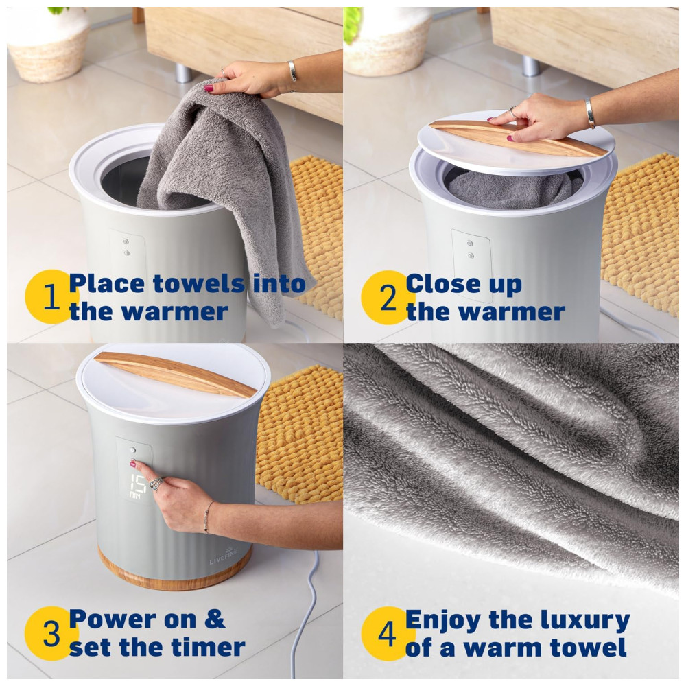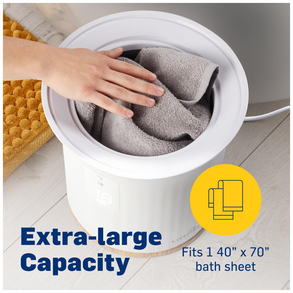 O elegante display LCD permite ajustar o tempo de aquecimento com facilidade, oferecendo opções de 15, 30, 45 ou 60 minutos. A unidade mantém a temperatura ideal durante todo o ciclo, garantindo um calor constante e confortável. Seu compartimento de aquecimento espaçoso é compatível com toalhas grandes, incluindo tamanhos de 101 cm x 177 cm, e outras opções para casais.