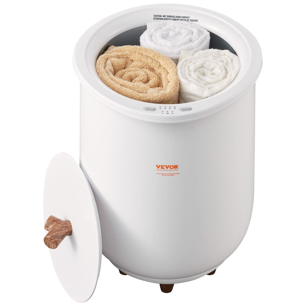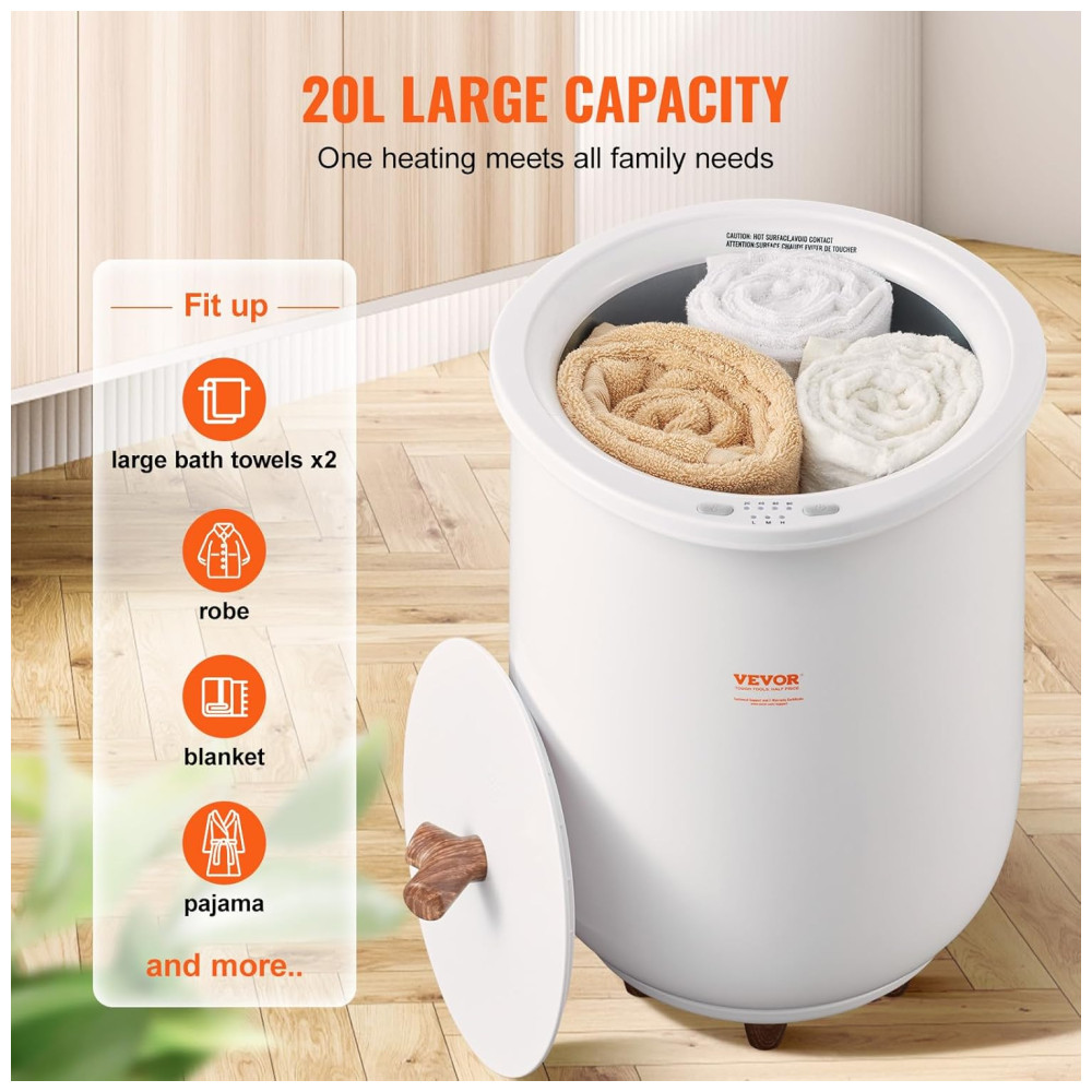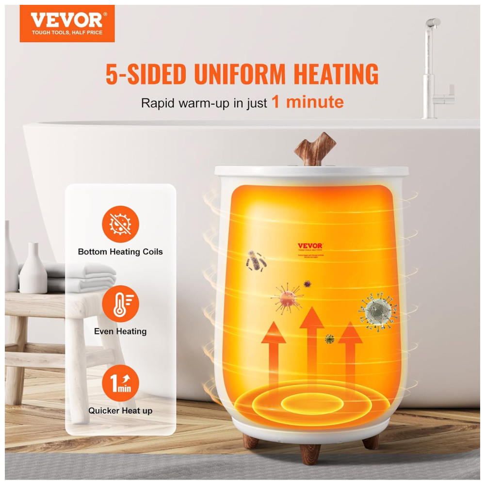 O aquecedor de toalhas VEVOR é uma excelente escolha para quem busca conforto e eficiência. Com uma capacidade generosa de 20 litros, ele acomoda facilmente duas toalhas grandes de 177,80 cm x 101,60 cm, ou cerca de 5 toalhas de banho de tamanho médio, além de roupões, cobertores e pijamas. O design inovador de aquecimento surround de 5 lados, que inclui aquecimento das paredes e do fundo do barril, permite que o aquecedor atinja rapidamente a temperatura desejada em apenas 6 a 10 minutos.