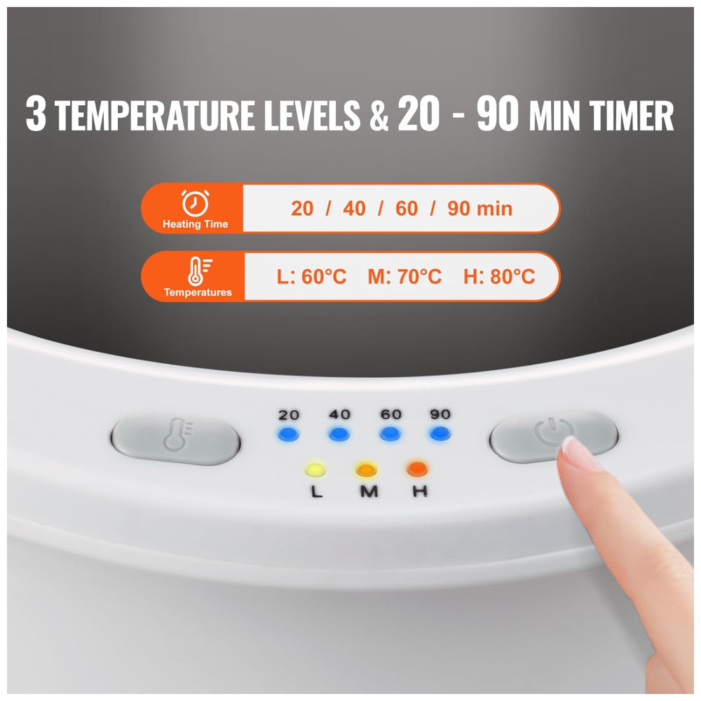 Este modelo oferece flexibilidade com quatro opções de temporizador (20, 40, 60 ou 90 minutos) e três configurações de temperatura (baixa de 60ºC, média de 70ºC e alta de 80ºC), garantindo que suas toalhas estejam sempre quentes conforme sua preferência. O aquecedor é certificado pela ETL e FCC e utiliza materiais retardantes de chamas V0 para garantir a segurança durante o uso.
