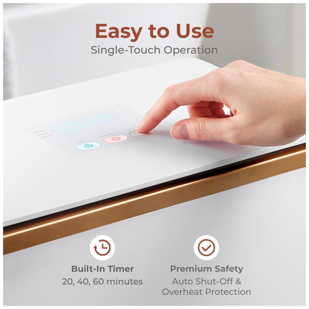 O controle Single Touch combina simplicidade e praticidade. O botão liga/desliga intuitivo garante facilidade de uso, enquanto o temporizador integrado permite ajustar a duração do aquecimento para 20, 40 ou 60 minutos conforme sua preferência. O recurso de desligamento automático previne o superaquecimento, garantindo segurança e eficiência energética.