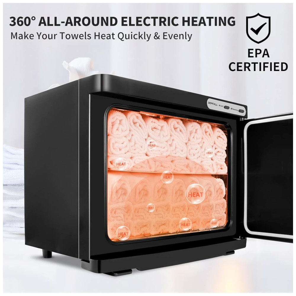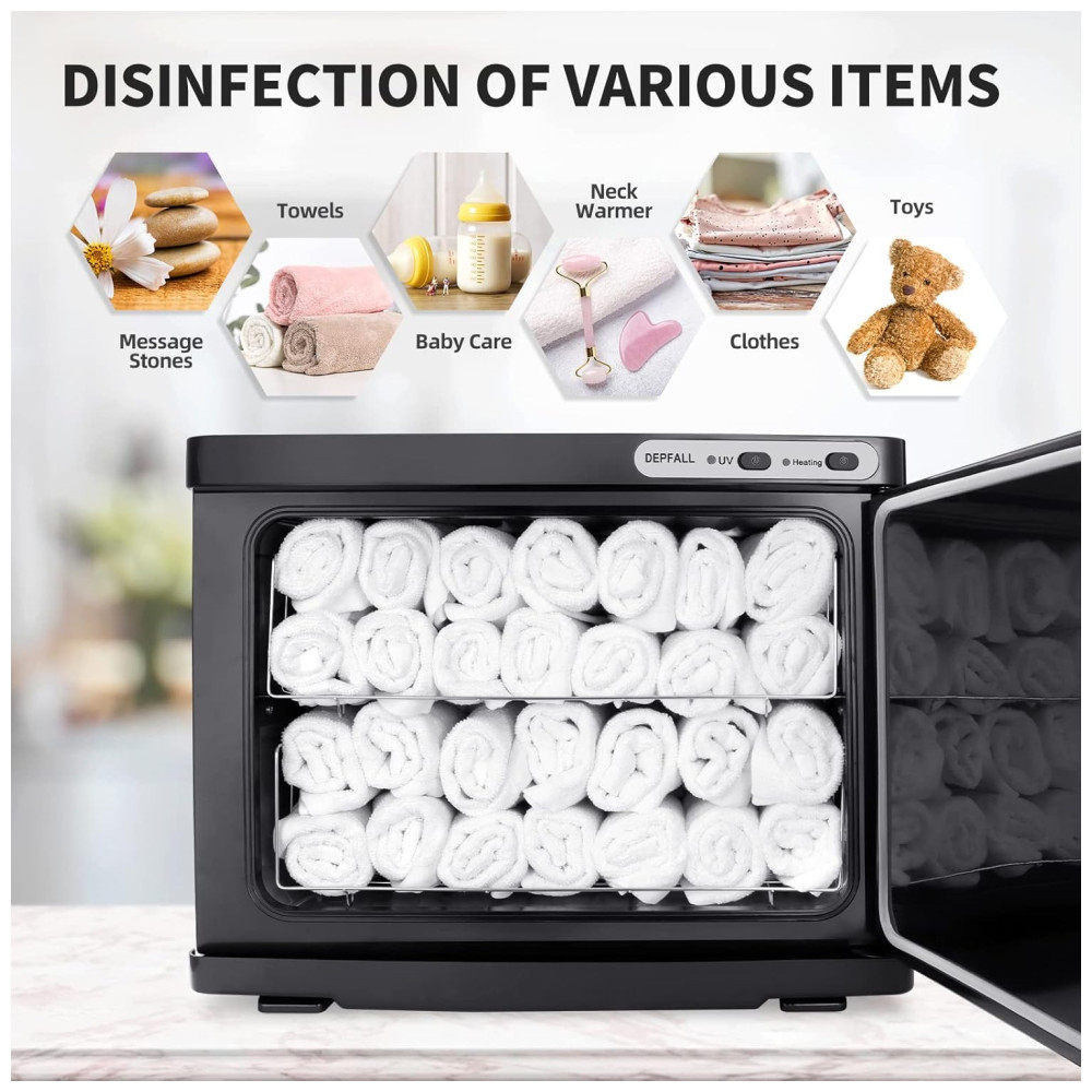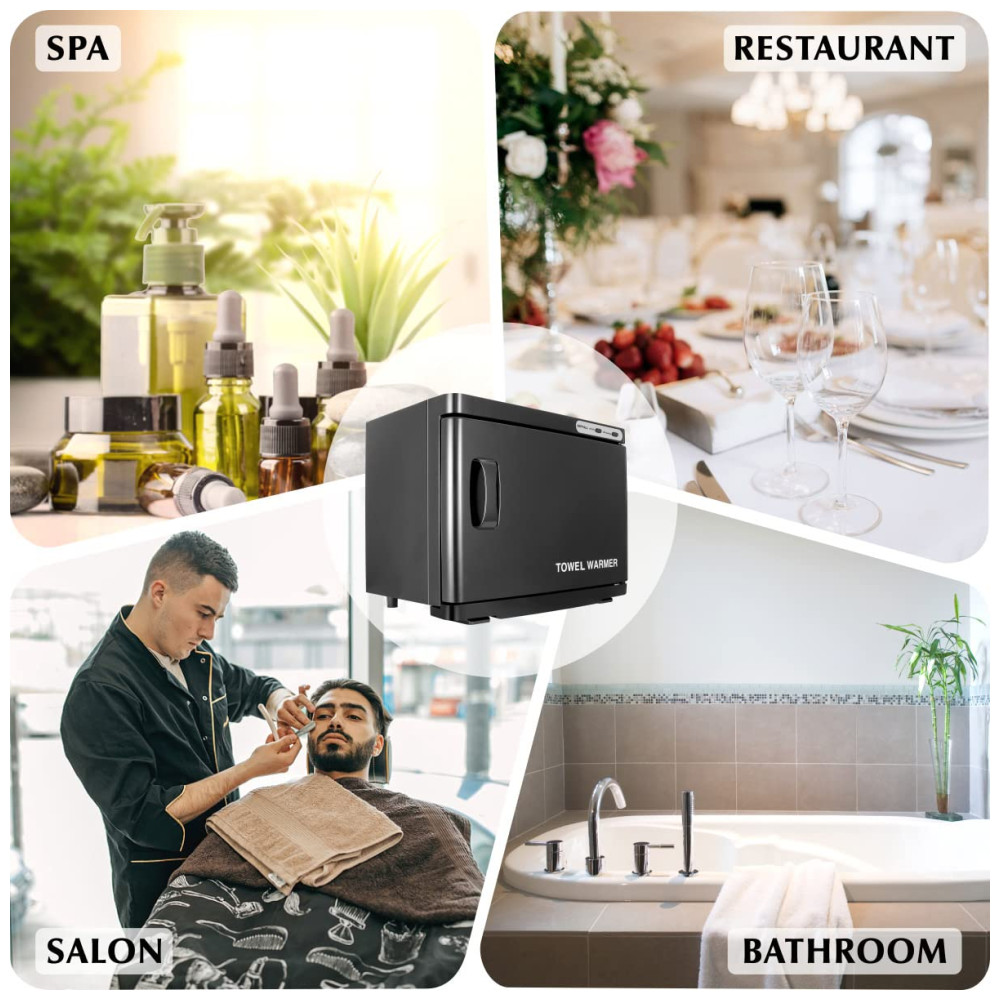 Poderoso sistema de aquecimentoVocê só precisa conectá lo à energia de 110V, colocar as toalhas molhadas e fechar a porta ligeiramente e pressionar o botão LIGAR, DESLIGAR e UV, a máquina de toalhas quentes pode ser aquecida rapidamente e uniformemente para aumentar média de 65 a 70 C. Em geral, aqueça por mais de meia hora. Se colocar muitas toalhas, aqueça por mais de 1 hora.