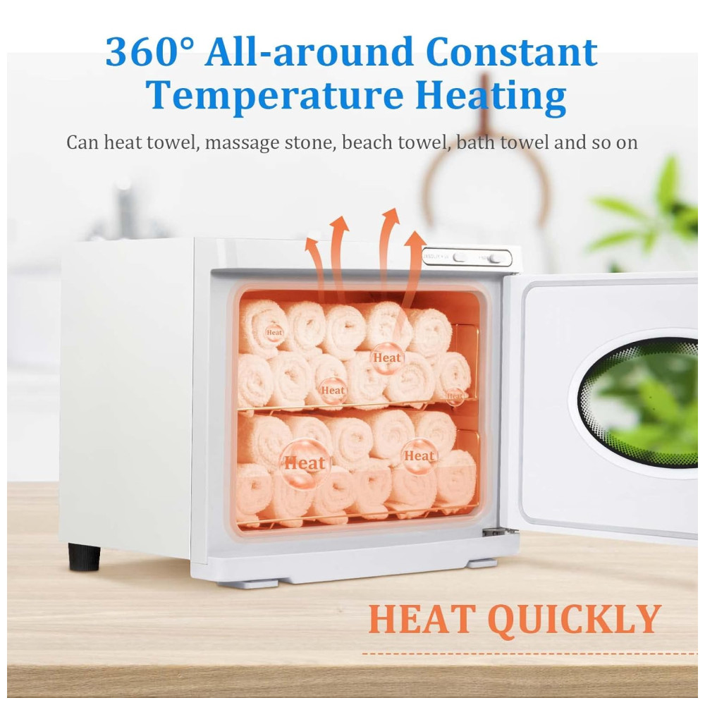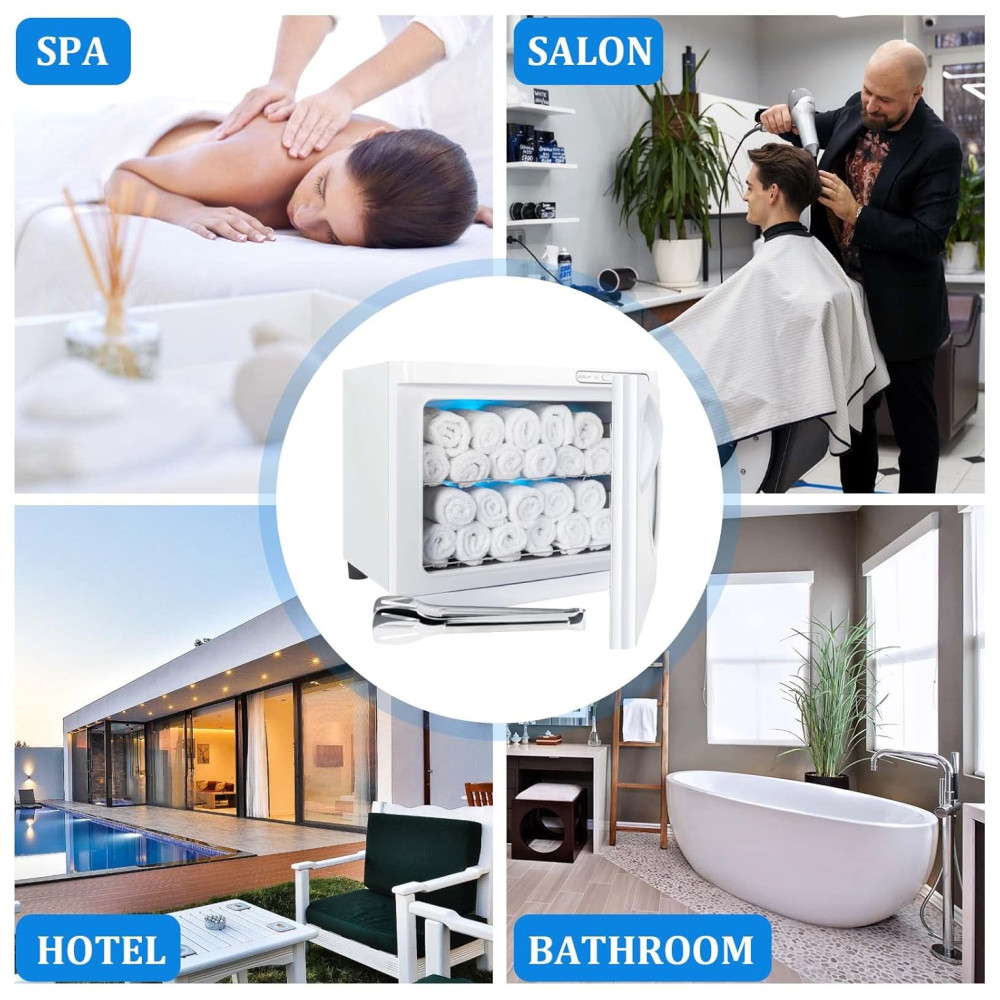 Aquecedor de toalhas quentes 2 em 1Com design de aquecimento e iluminação, o nosso aquecedor de toalhas quentes não apenas aquece as toalhas, mas também pode ser para aquecer toalhas de banho, compressas quentes, aquecedores de pescoço, pedras de massagem e outros utensílios. É ideal para banheiros, spas, salões de beleza, massagens, academias, hotéis e uso doméstico