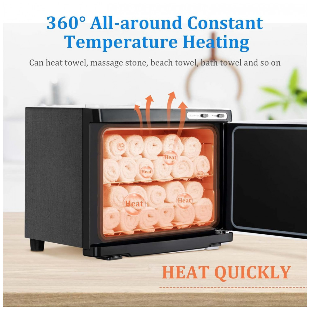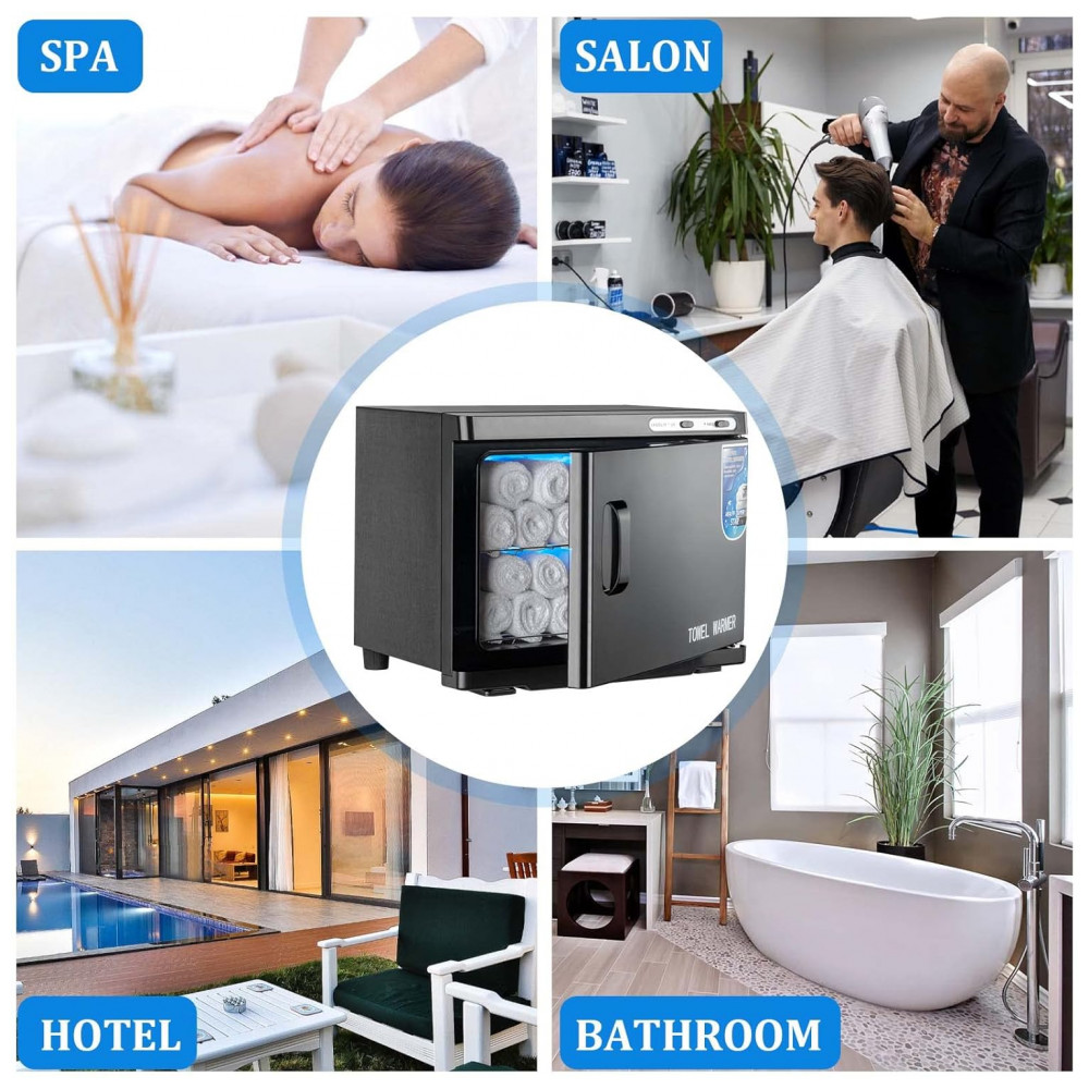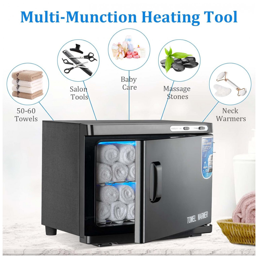 Aquecedor de toalhas quentes 2 em 1Com design de aquecimento e iluminação, o nosso aquecedor de toalhas quentes não apenas aquece as toalhas, mas também pode ser para aquecer toalhas de banho, compressas quentes, aquecedores de pescoço, pedras de massagem e outros utensílios. É ideal para banheiros, spas, salões de beleza, massagens, academias, hotéis e uso doméstico
