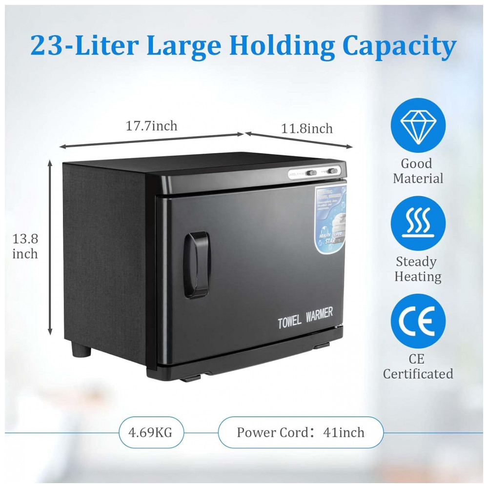 Gabinete de toalhas aquecidas de grande capacidadeO armário aquecedor de toalhas de grande capacidade de 23 litros inclui uma bandeja coletora, dois racks de aço inoxidável, um manual de instruções e um clipe. Com dois racks de aço inoxidável de duas camadas, pode acomodar de 40 a 50 toalhas de tamanho normal. O tamanho do armário aquecedor de toalhas é de x x 35 centimetros C x L x A, pesando 8 kg. É leve, possui um bom tamanho e é muito prático.