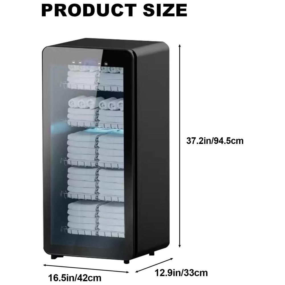 Sua operação é simples e eficiente, com um painel de toque intuitivo e um interruptor de 4 botões, complementado por botões de toque e um elegante display LED. Este modelo versátil vai além do aquecimento de toalhas, sendo ideal para salões de cabeleireiro, spas, estúdios de ioga, hotéis e residências, com capacidade para até 60 toalhas de rosto. É a escolha perfeita para quem busca eficiência e estilo em um único equipamento.