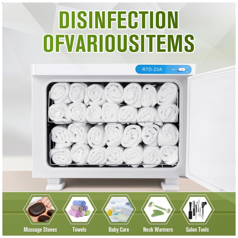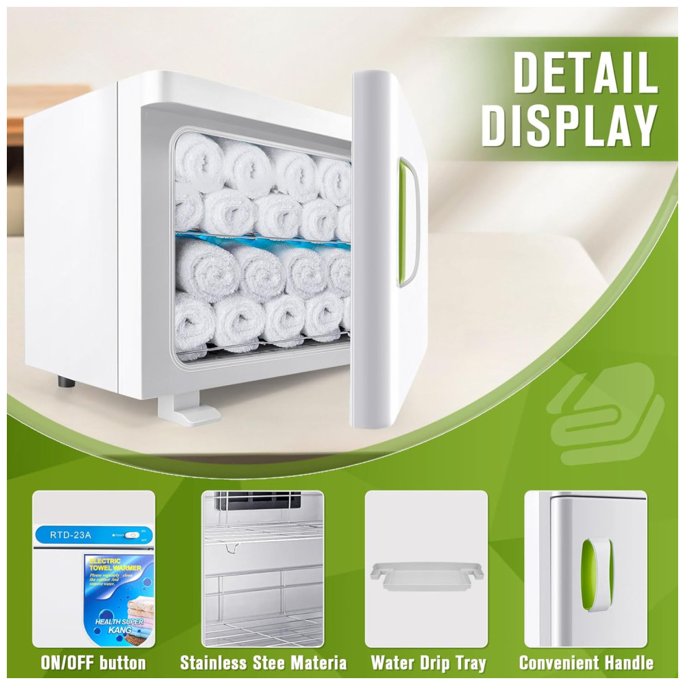 Aquecedor de Toalhas Quentes 2 em 1: Este aquecedor foi projetado para fornecer calor e limpeza para toalhas faciais, toalhas de banho, roupas íntimas, ferramentas de unha, pedras de massagem e outros acessórios de beleza. Ideal para uso em residências, spas, banheiros, salões de beleza, hotéis, restaurantes e cozinhas. A luz interna melhora o processo de aquecimento e limpeza, garantindo higiene e conforto ideais.
