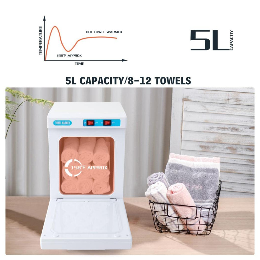 Capacidade de 5L: O aquecedor pode armazenar aproximadamente 8-12 toalhas faciais de tamanho normal (dependendo do tamanho das toalhas), proporcionando conveniência e eficiência.