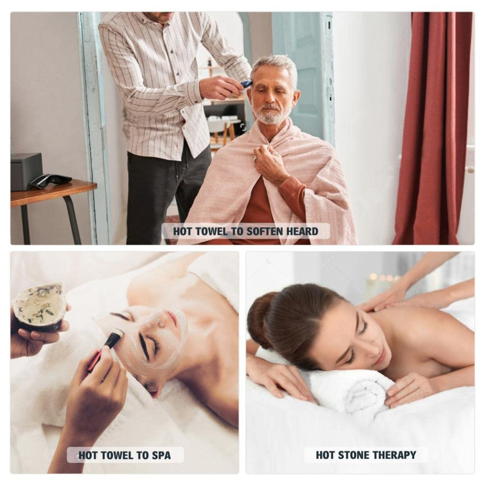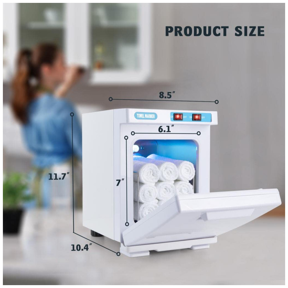 Tamanho: Este aquecedor possui 21,6 cm de comprimento, 26,4 cm de profundidade e 29,5 cm de altura, sendo leve e ideal para barbearias ou salas de massagem. A trilha removível (em aço inoxidável) é fácil de retirar para limpeza.