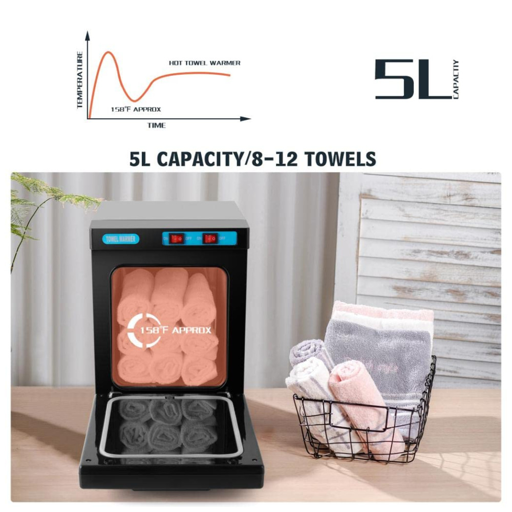 Capacidade de 5L: O aquecedor pode armazenar aproximadamente 8-12 toalhas faciais de tamanho normal (dependendo do tamanho das toalhas), proporcionando conveniência e eficiência.