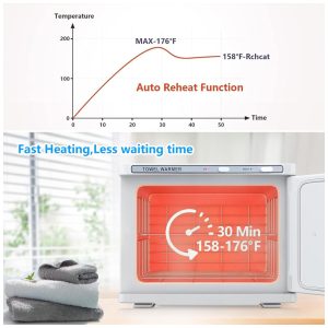 Aquecedor de Toalhas de Aquecimento Rápido: O aquecedor de toalhas JXSDLIY de alta potência (200W) aquece rapidamente e de forma uniforme até 80°C (176°F) em cerca de 30 minutos. Seu sistema de controle térmico automático mantém as toalhas na temperatura ideal de 65°C a 70°C (149°F-158°F), perfeito para serviços de spa e salão de beleza. Para melhores resultados, umedeça as toalhas com água morna e retire o excesso antes de colocá-las no aquecedor.