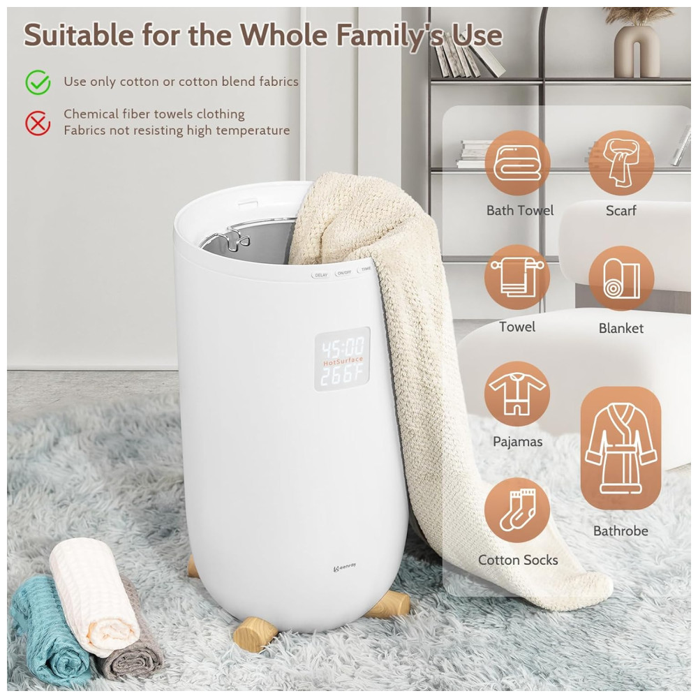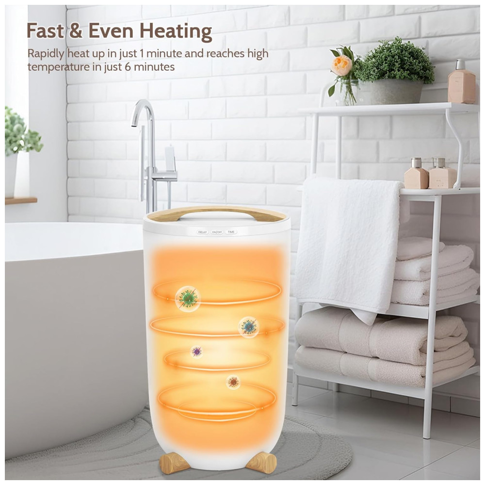 Aquecimento Ajustável & Timer de Atraso: O aquecedor de toalhas aquece rapidamente em apenas 1 minuto, atingindo altas temperaturas em 6 minutos. O balde do aquecedor possui timer de atraso de até 24 horas, permitindo que você tenha toalhas sempre aquecidas, configurando o tempo de aquecimento para 15, 30, 45 ou 60 minutos antes de desligar automaticamente. Ideal para banhos rápidos ou relaxantes, proporcionando mais confiança no uso.