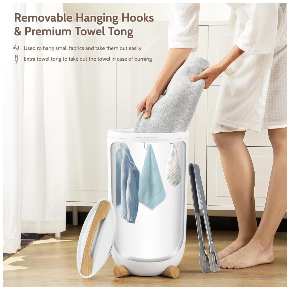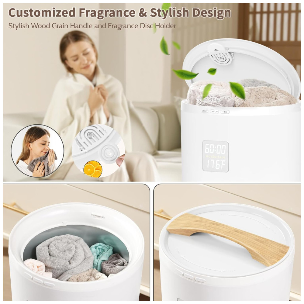 Design Melhorado e Amigável: O aquecedor de toalhas foi projetado com um visual elegante para combinar com diversos estilos de decoração. Possui armazenamento de cabo integrado na base e um suporte para o cabo extra longo na parte traseira, mantendo a área organizada quando não estiver em uso. Inclui um suporte para disco de fragrância, permitindo personalizar o aroma desejado.